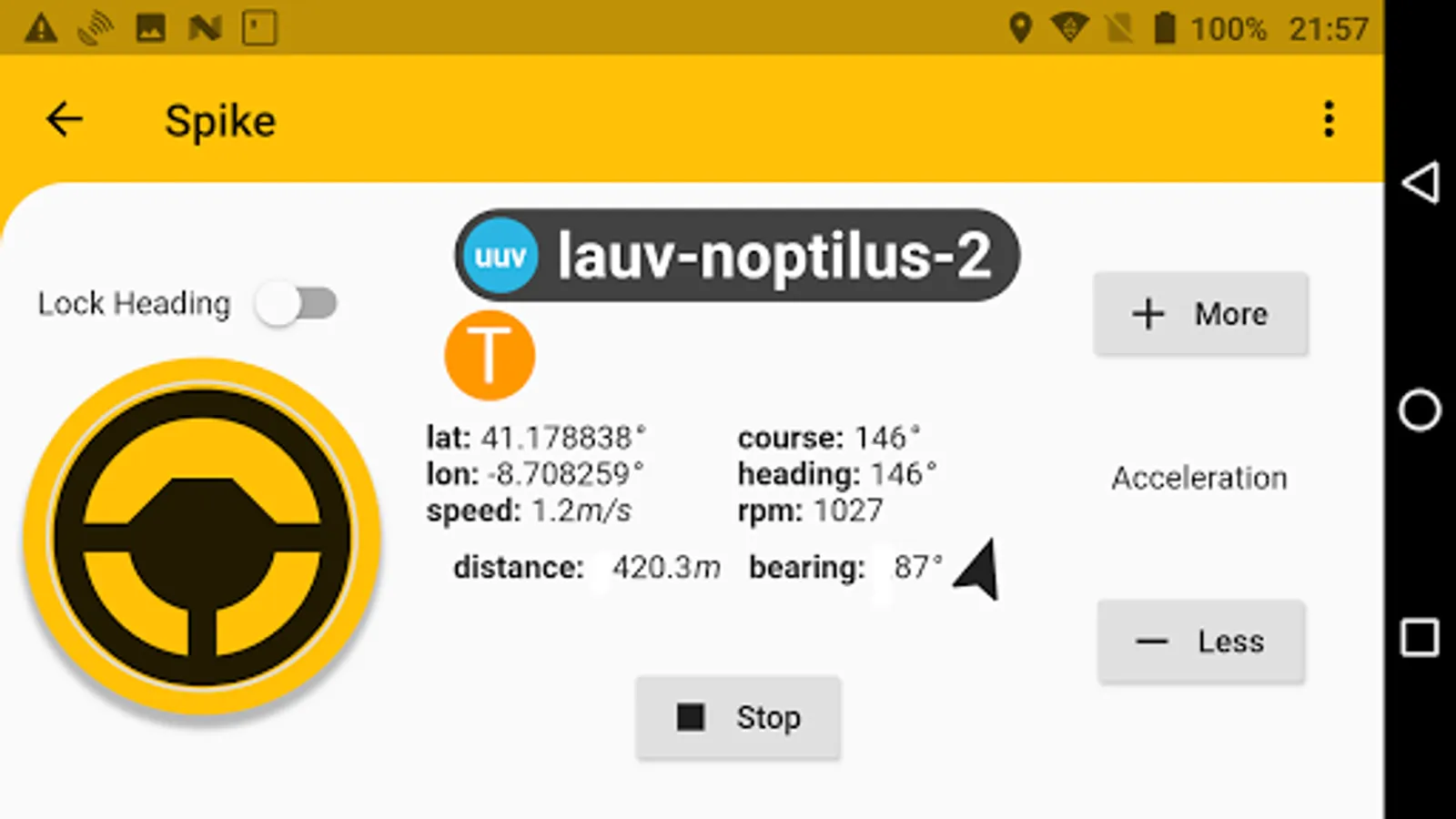 It supports live monitoring of data, vehicle teleoperation and commanding plans and other helper commands over Wi-Fi (launcher, come near, dive). It has other interfaces that help you for instance find where the vehicle is using the phone’s location and heading. At the moment it is more tailored for AUV operation, but it will eventually evolve to other types.