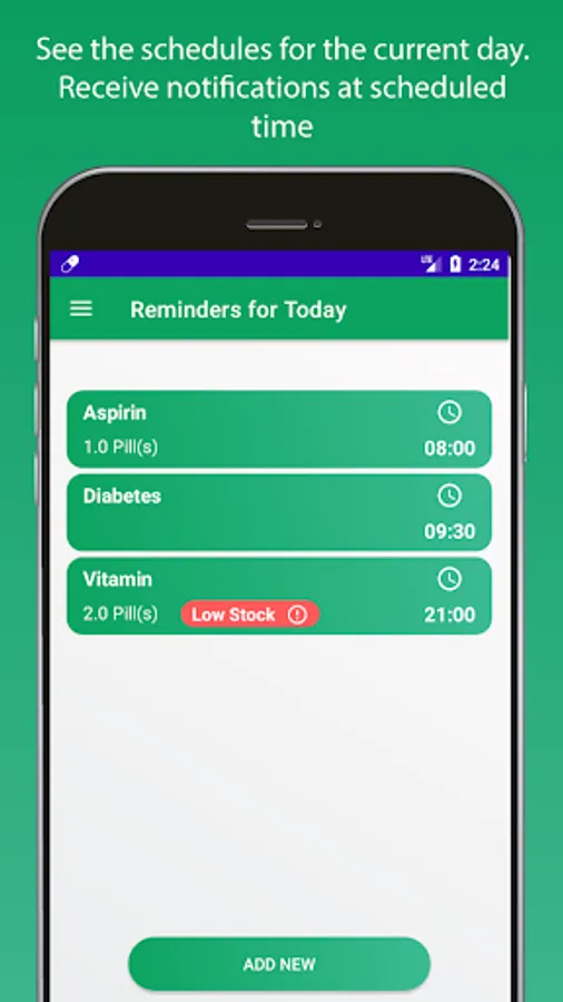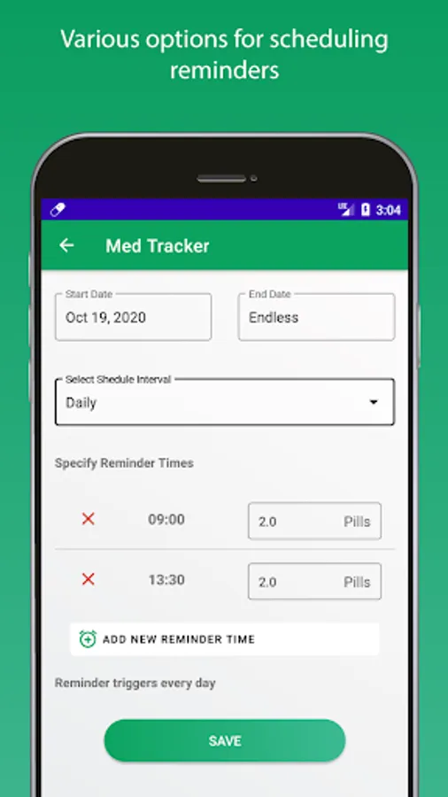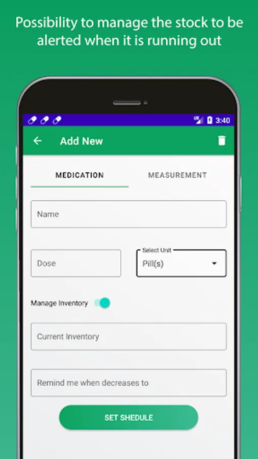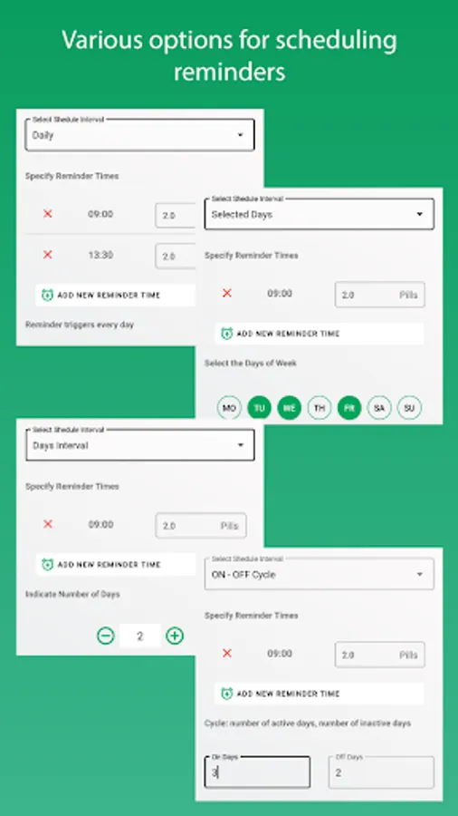 For each medication you can set different times for the same day as well as the respective dose. You have the option for reminders to be shown: