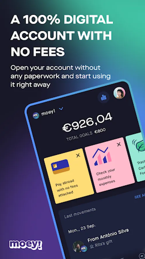 Your moey! bank account is 100% digital, has zero costs and works with MB WAY