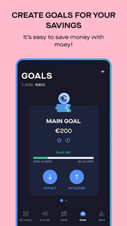 - Goals: save money easily. Set your saving goals, when you want to reach that goal and how often you want to save.