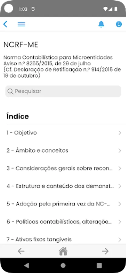The APP provides the 28 NCRF, the NCRF-PE, the NCRF-ESNL, the 2 NI, the Conceptual Structure, NC for Microentities, the Financial Statement Models, the Code of Accounts, a SNC glossary, DL 158/2009 (2015) , DL 98/2015 (SNC 2015), DL 36-A/2011, Ordinance 220/2015, the possibility of searching, the possibility of printing, the possibility of sharing and, whenever the accounting regulations suffer changes, the APP will be updated.