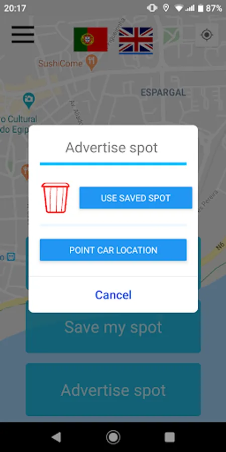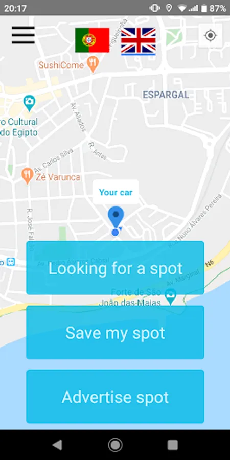 • There is the option on the main menu to save the parking space position when you park your car, this will facilitate the publication of your parking space later.