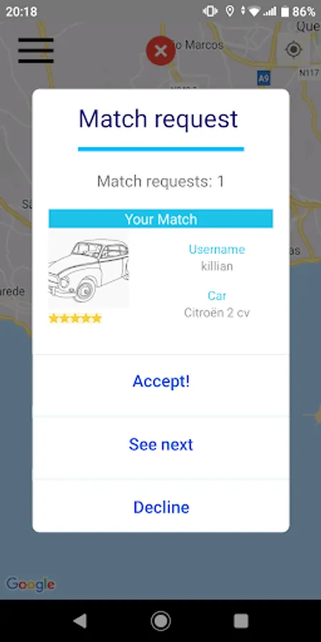 • In case of the timer runs out before the your status is updated to “I'm in the car”, the user who was looking/got the parking place can cancel the partnership and report misconduct.