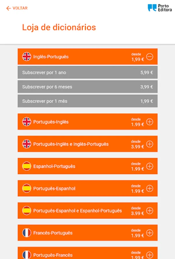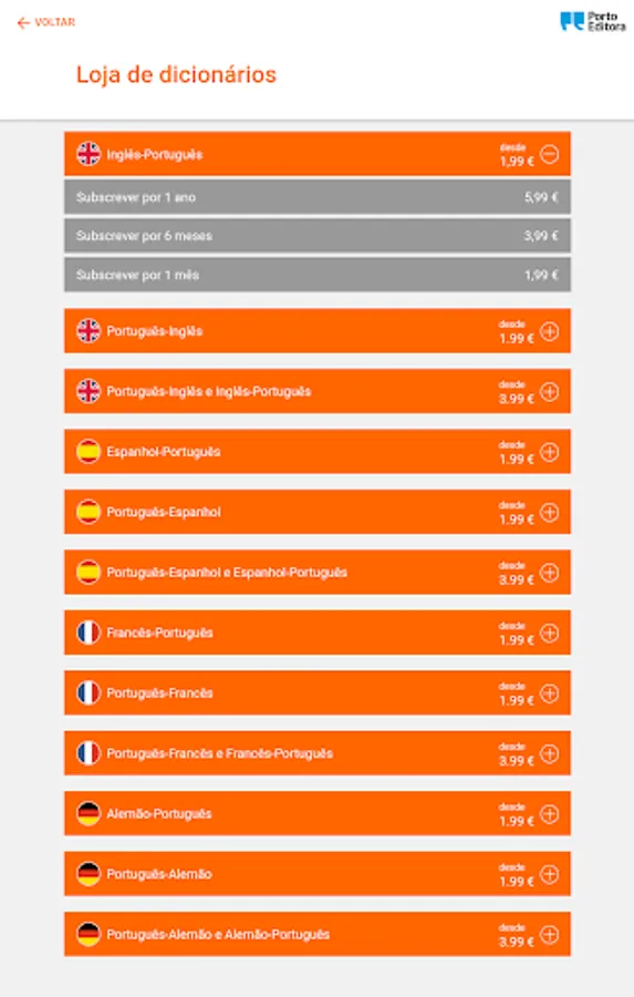 A app Dictionary Porto Editora is the most complete application of dictionaries, in Portuguese, available on Google Play. This app allows the subscribe (for 1 month, 6 months or 1 year) , without advertising, the following bilingual dictionaries: