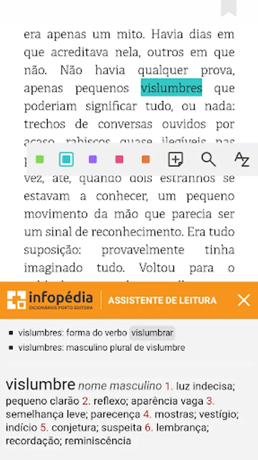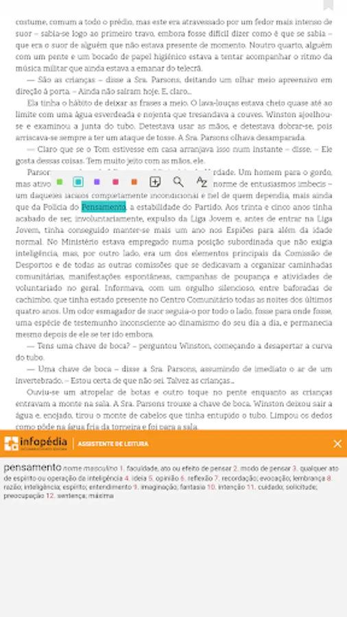 You can answer questions related to any word in your eBooks using the reading assistant. Select a word and Infopedia will immediately present its definition.