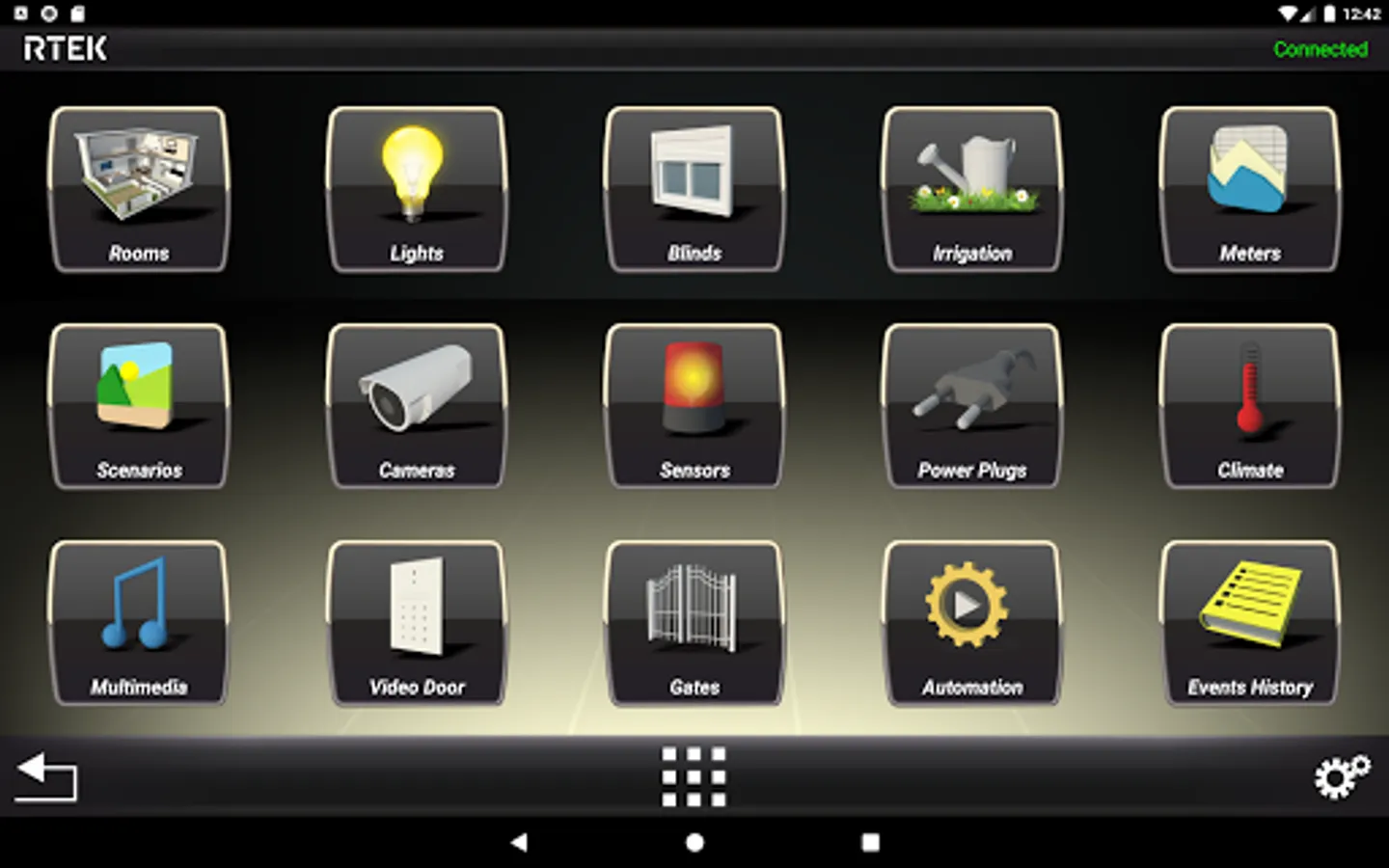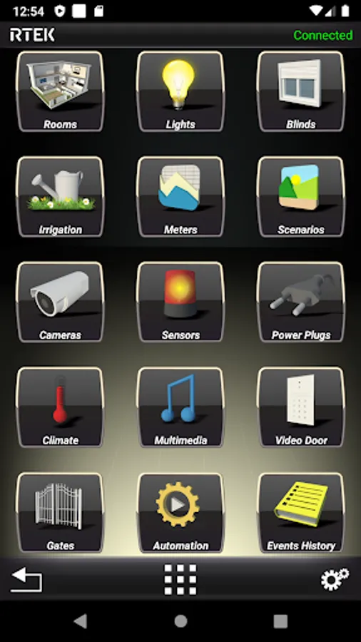 RTEK system integrates lights, blinds, power plugs, smart glasses, flood sensors, smoke sensors, irrigation, surveillance cameras, video-door, burglar alarm, multiroom sound system, TVs, Home Cinema, gates, hydraulic climate systems, air conditioners, electricity and water meters, and many other devices.