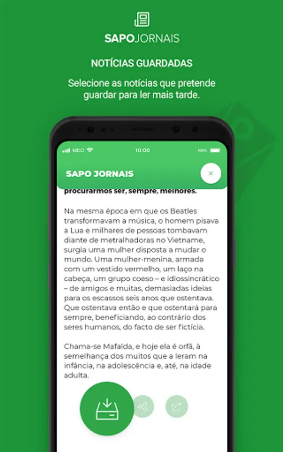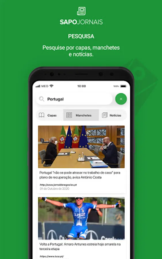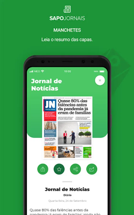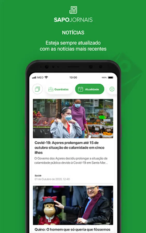 In the SAPO Jornais application, you will be able to consult daily the covers of all the national press and the covers of publications from 49 countries around the world, in addition to the news, minute by minute. Select your favorite covers to quickly access your favorite content. Save news to read later. Search for covers, news or headlines