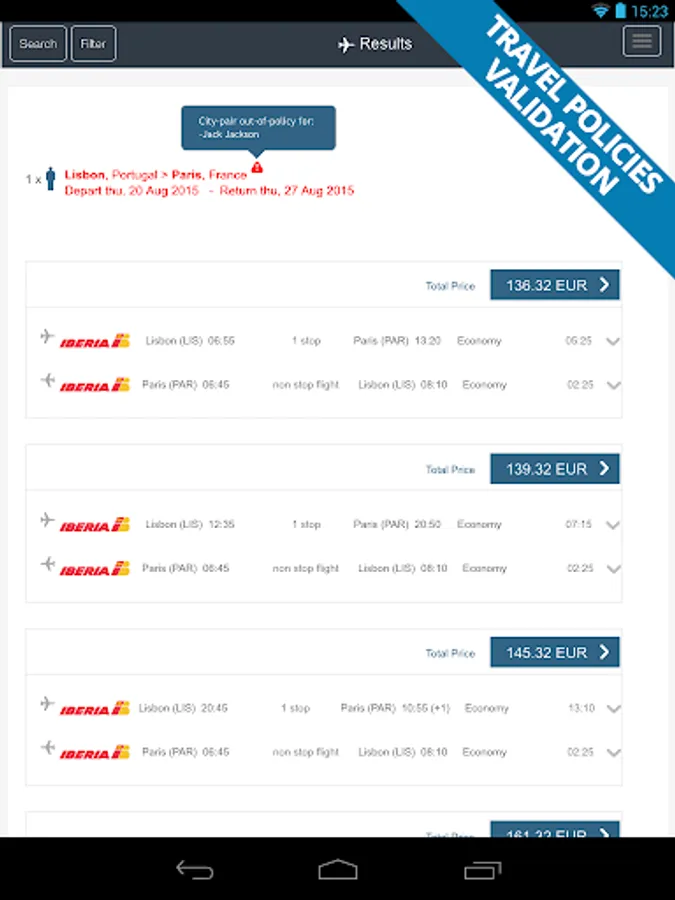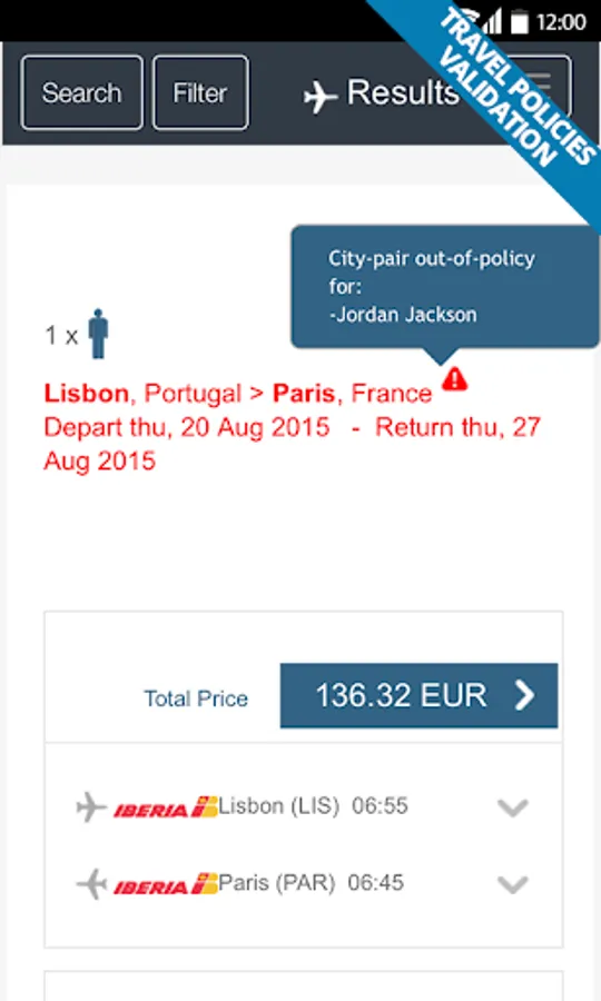 Search results are validated according with each traveller travel policy and out-of-policy results are highlighted on screen to alert the user. Travellers' out-of-policy products if added to the trip are marked accordingly during all the booking process.