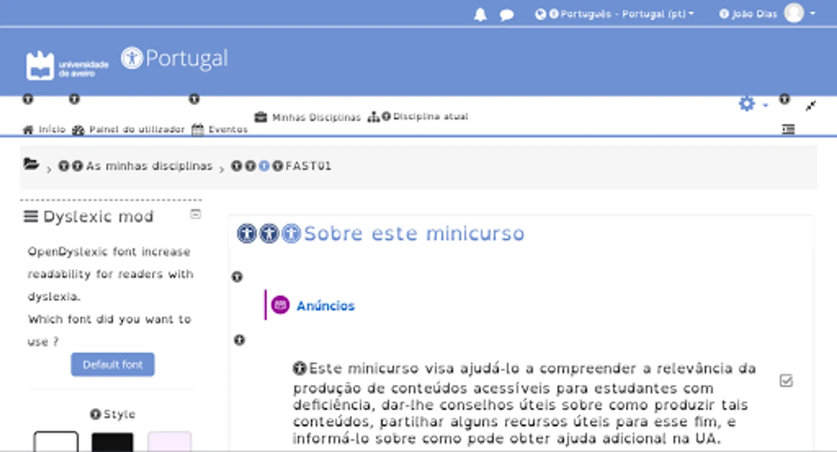 The application allows access to the Moodle of projects at the University of Aveiro, which includes specific accessibility features for dyslexic students and those with visual and hearing impairments. The application allows you to configure moodle to use different contrasts and dyslexic fonts; use automatic screen readers, and view menus using videos in Portuguese sign language.