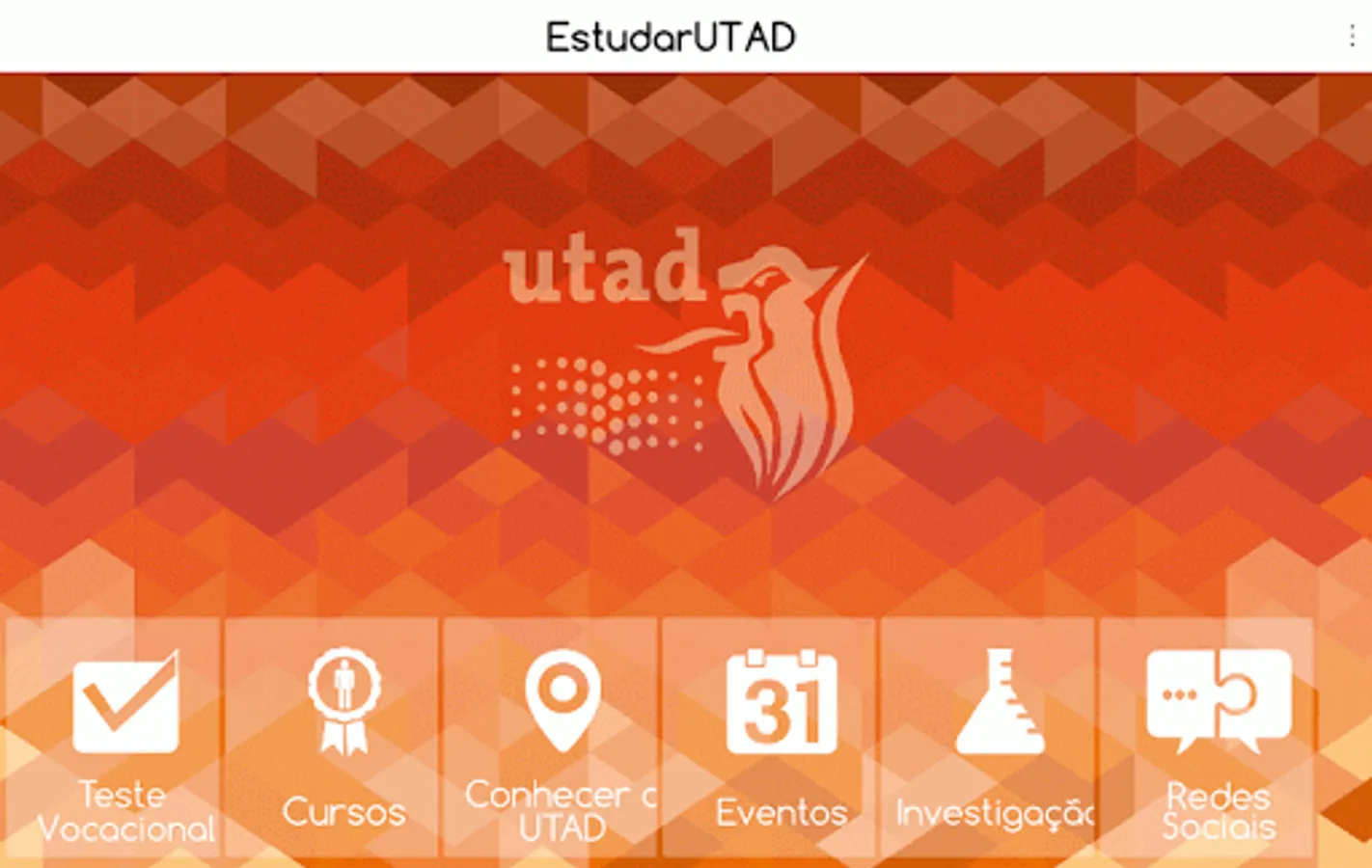 This application is directed to secondary school students who wish to apply to higher education. Here you will have access to the necessary information about the courses that the University of Tras-os-Montes and Alto Douro offers. The course plans and tests for applications of the intended track are available. May make a vocational test to get a help in defining which areas best fit to their profile. Young people still have access to the information disclosed through social networks, opinions alumni and know better what the university has to offer them.