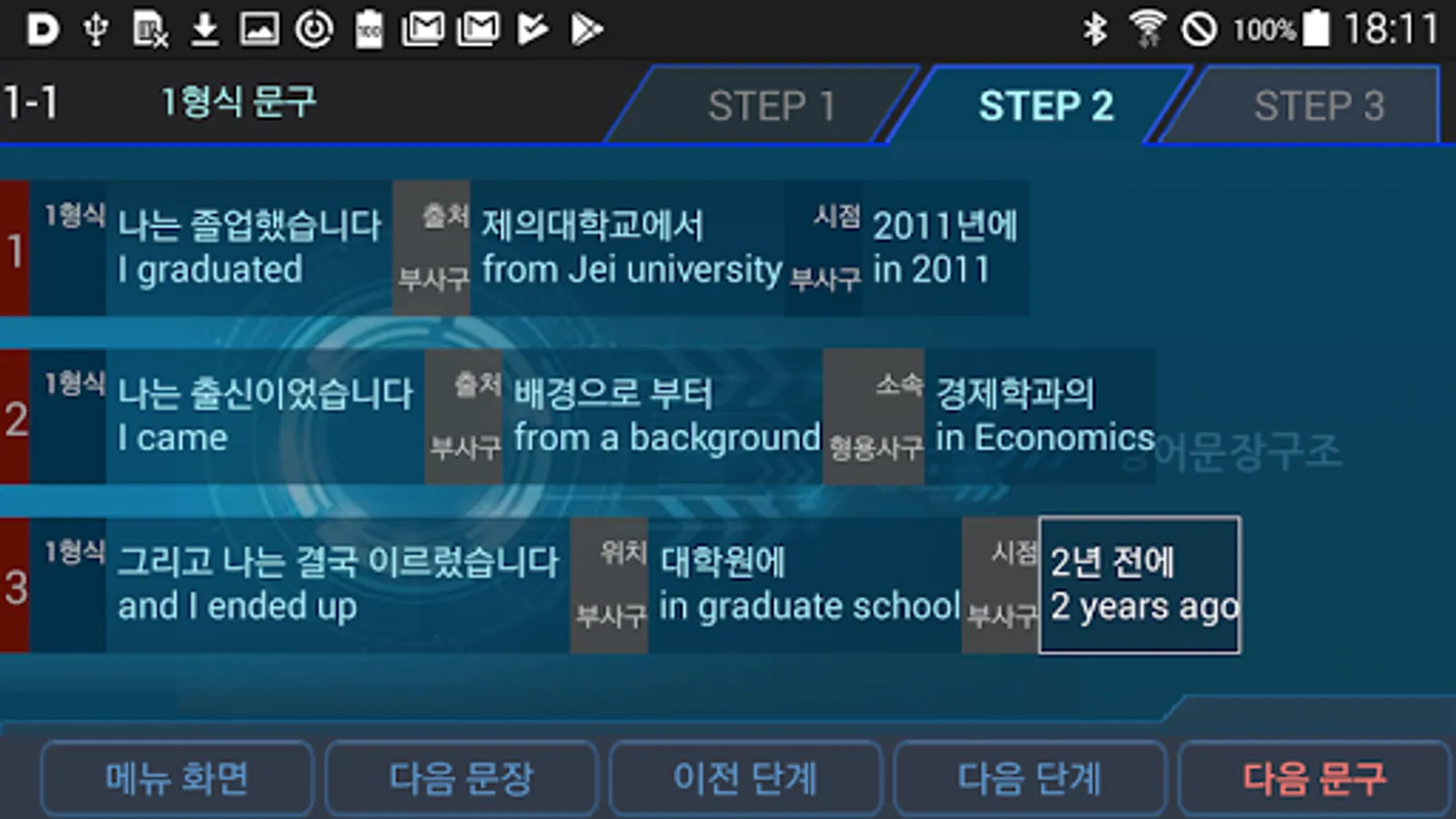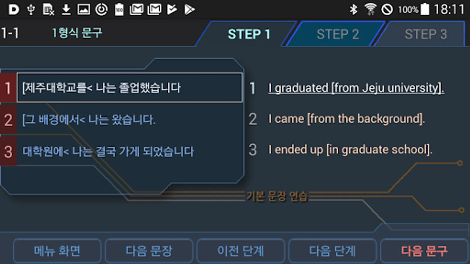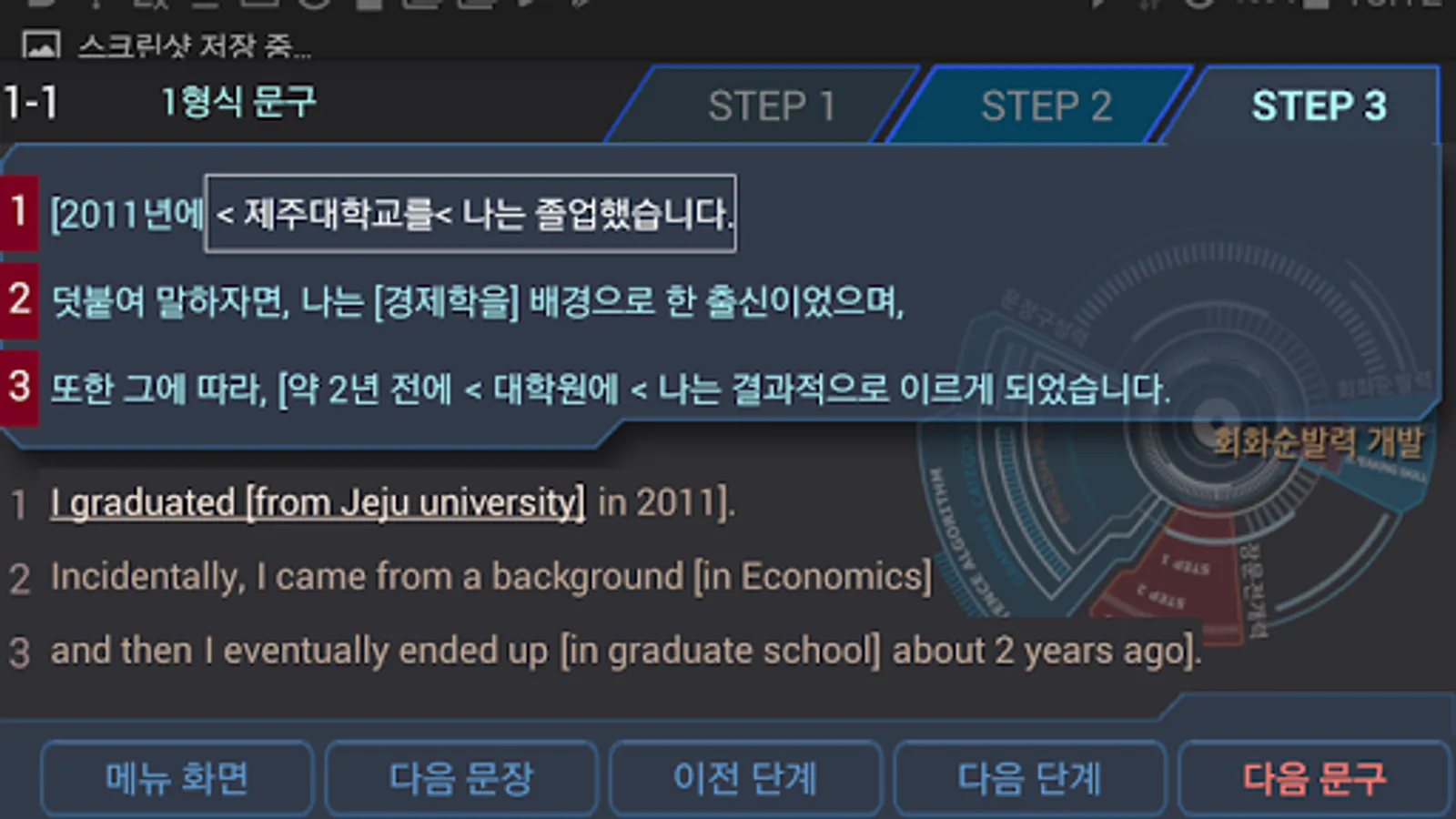 이 앱은 3단계에 걸쳐 영어문장을 점진적으로 추가하여 연습함으로써