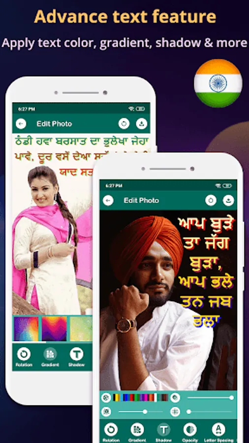 You can Write Punjabi Shayari, Your Name on photo in Punjabi, Punjabi Poetry, Punjabi Suvichar, Punjabi Gazal, Punjabi Jokes, Punjabi Poem and Messages easily with the help of Punjabi keyboard on your selected photo from gallery or camera.