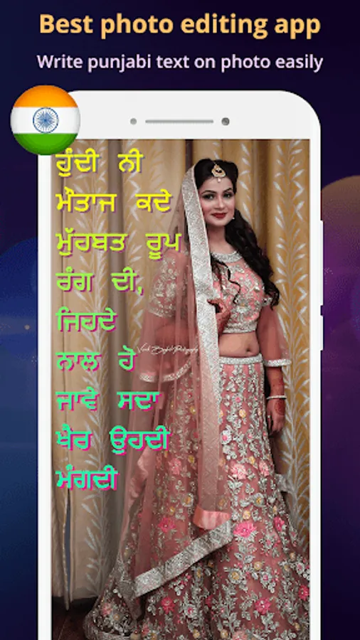 Write Punjabi Text On Photo helps to add your feelings for every upcoming festivals like Baisakhi, Holi, Diwali, Karva chauth,Buddha Purnima, Eid, Janmashtami, Christmas, Pateti, New Year, Navratri, Muharram, Pongal, Vaisakhi, Vaisakhadi, Bahag Bihu, Cheti Chand, Gudi Padava, Onam, Ganesh Chaturthi etc. and send greetings to your friend and family by write status in Punjabi, write Punjabi poetry or Punjabi text on your favorite photo using Punjabi keyboard.