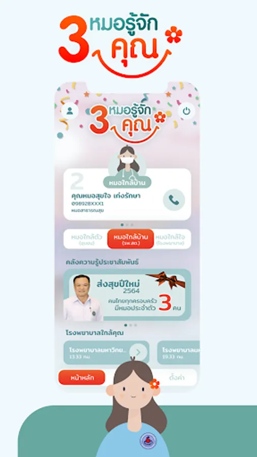 Application 3 Doctors know you, the system of receiving medical and public health services via smartphones for the public sector users. Develop a good quality of life for people and staff to have them together. Focus on taking care of your own health. Show medical information With news from family doctor clinic