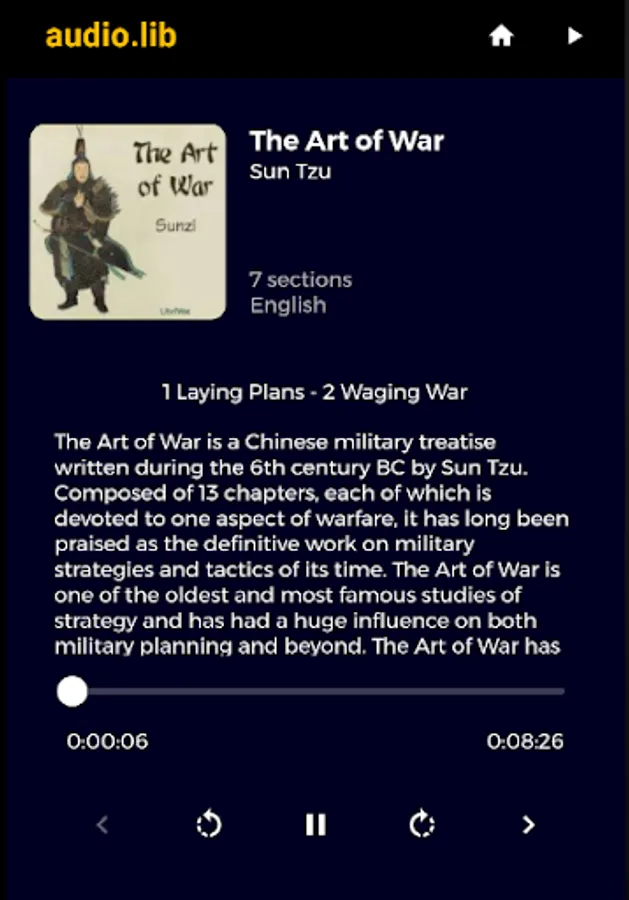audio.lib is a collection of carefully selected classical books about personal development and growth, self help, healthy life, motivation, good mood, wisdom, spirituality, romance, psychology, children's books. For English learners, you can listen to the audiobooks to improve your listening and expand your vocabulary.