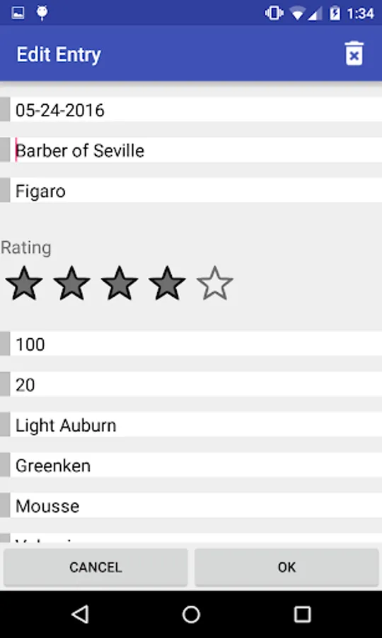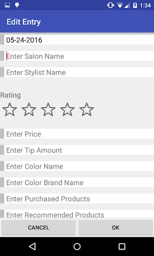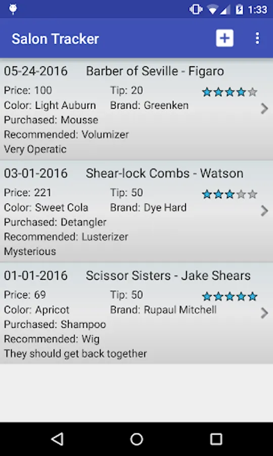 Use the Salon Tracker to keep track of all of your visits to the salon. Users can record the date, salon name, stylist name, rating, color, color brand, purchased products, recommended products, and any notes from the visit. All of the haircut data is displayed so users can quickly look at all of their past haircuts.