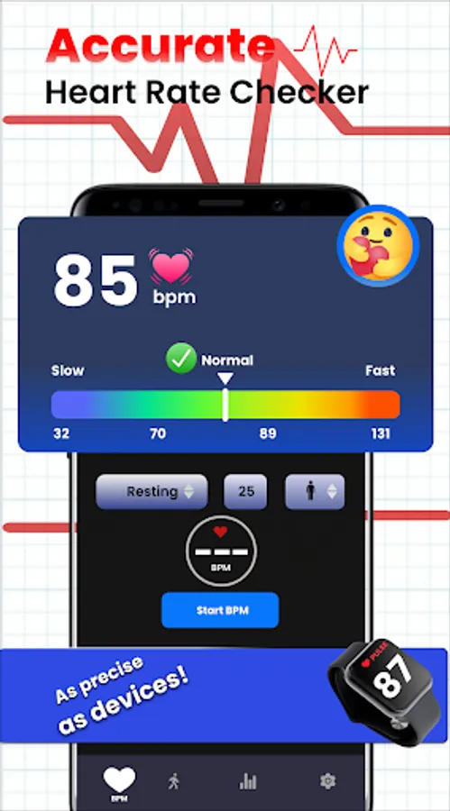 Looking for an easy and convenient way to track your heart rate? Our Heart Rate Monitor app allows you to do just that by simply placing your fingertip on the camera lens of your phone. The app will display your heart rate in just a few seconds, making it a fun and useful way to monitor your body's response to different activities or track your fitness level over time.