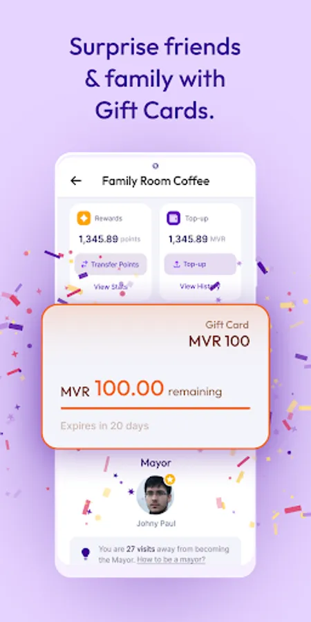 • Gift Cards: Users can get or give gift cards with a special message or terms of use from their favorite stores.