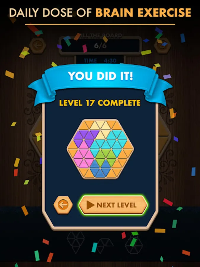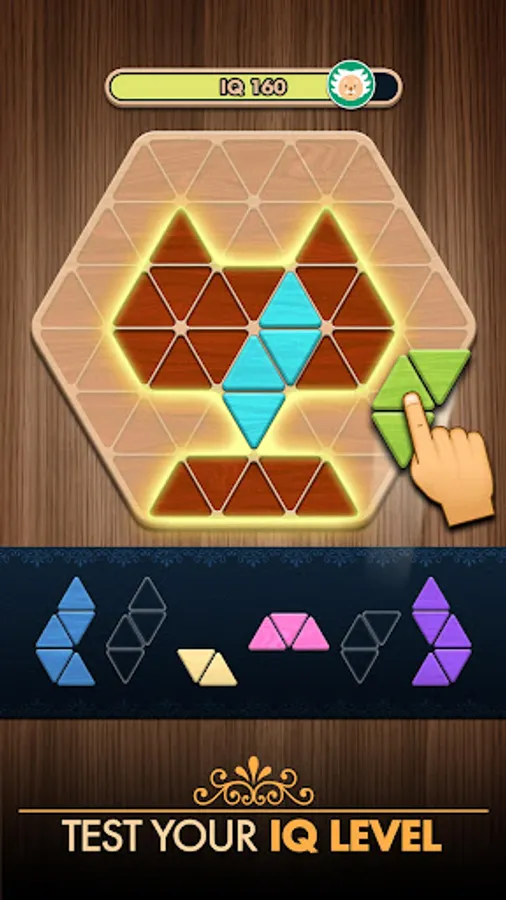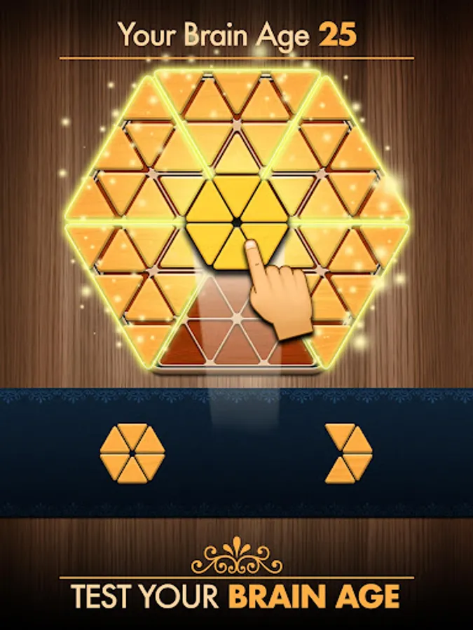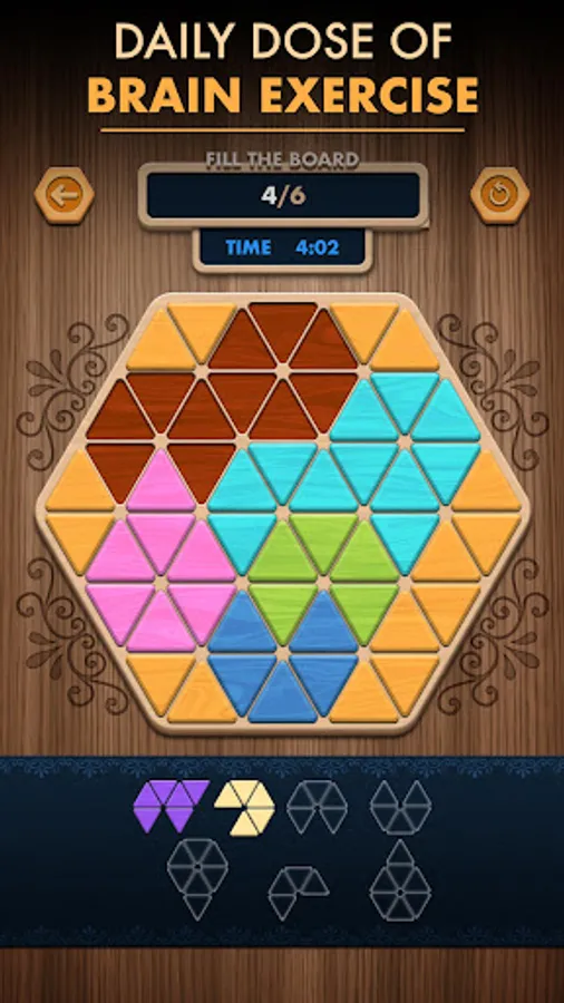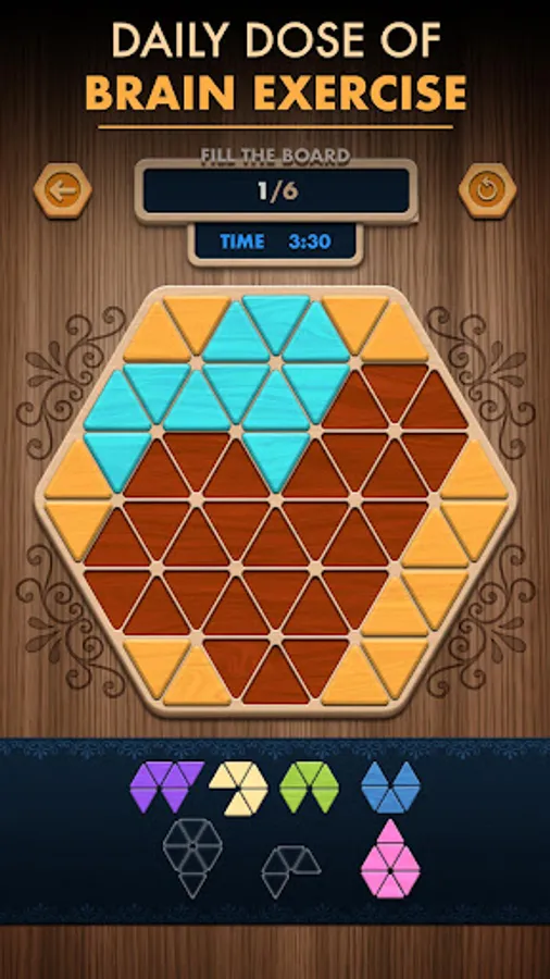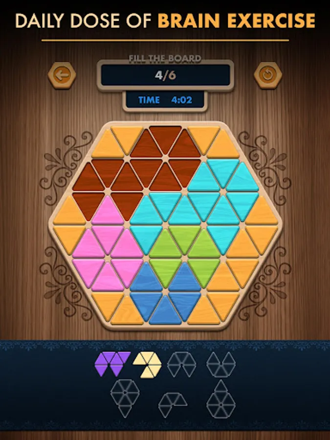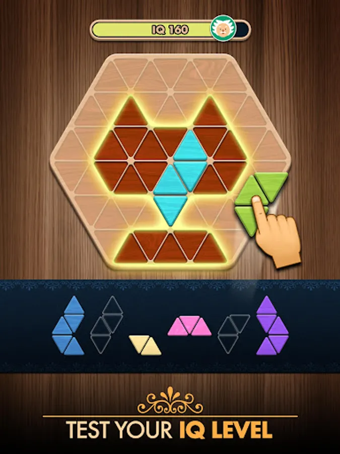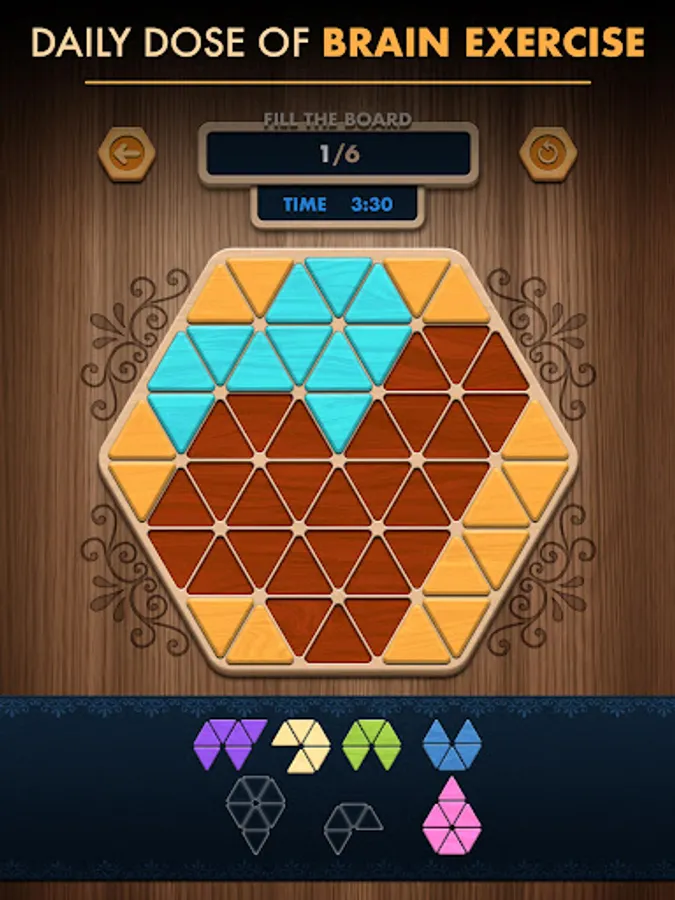 Woody Poly delivers a quality puzzle experience with its unique gameplay. No more usual square game board and normal shaped blocks, this brand-new game welcomes you to the world of triangular puzzle pieces and an impressive hexagonal board.