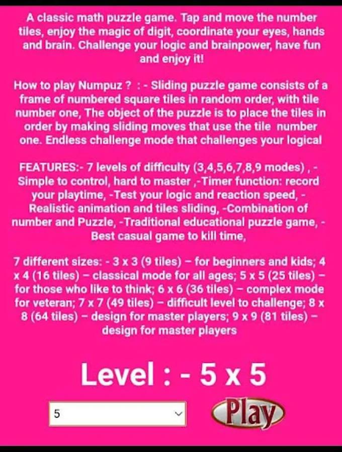 -7 levels of difficulty (3,4,5,6,7,8,9 modes)