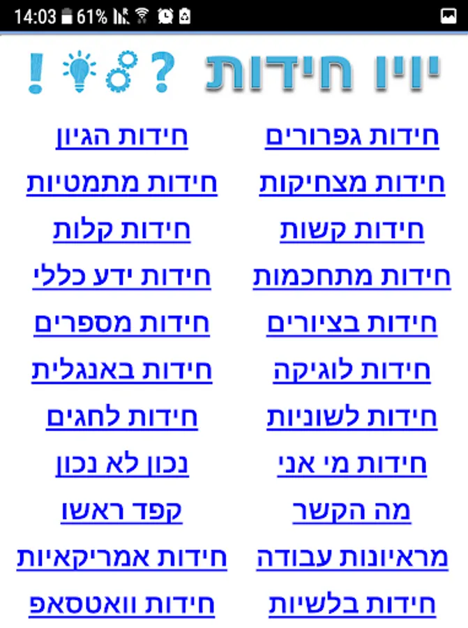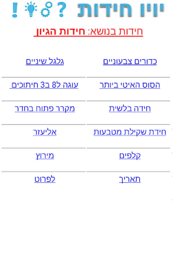 Yoyo puzzles, thousands of challenging puzzles for all ages, puzzles with solutions of course. English riddles with answers, application of Hebrew puzzles, riddles divided into categories cool puzzles, difficult puzzles, riddles ease, logic puzzles, riddles Sleuths, puzzles whatsapp and others. Each puzzle has a hint and solution, then begin to solve and turn on the computer