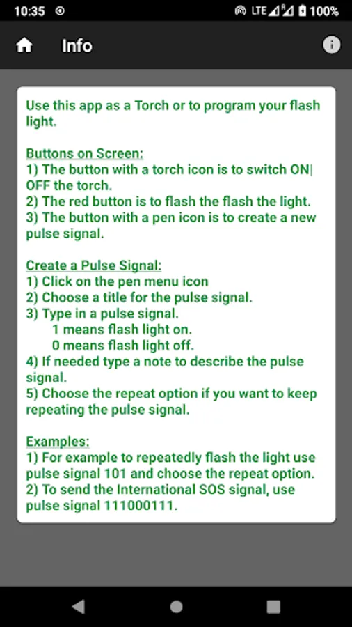 For example to repeatedly flash the light use pulse signal 101 and chose option repeat. To send the International SOS signal, use pulse signal 111000111.