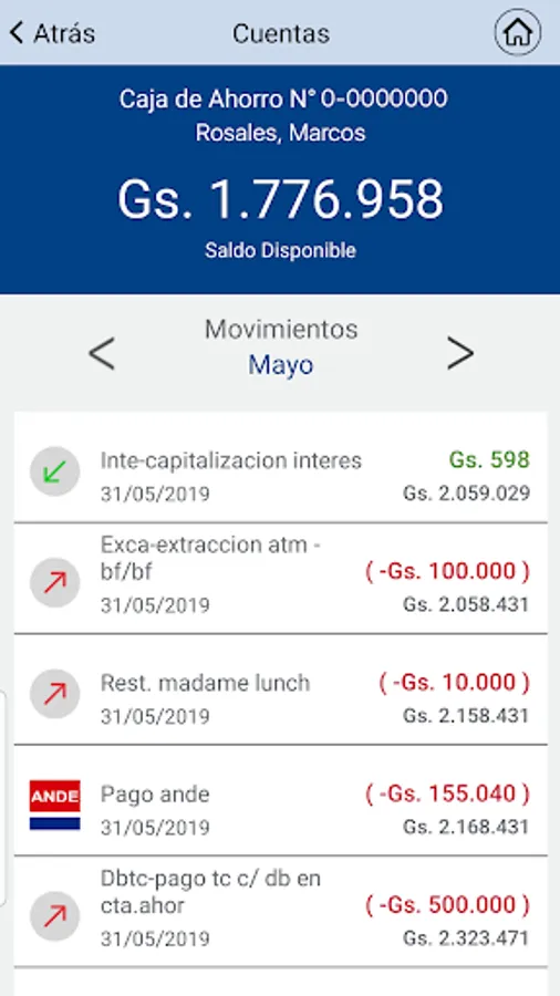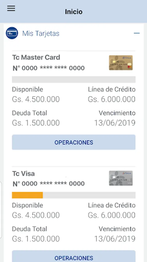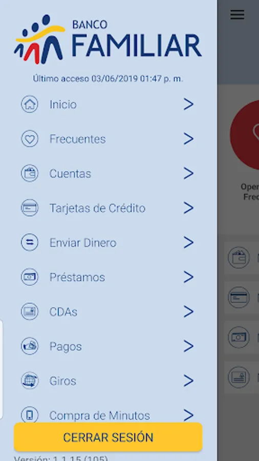 • Consult movements, lines of credit, total debt, available balance and make payments of credit cards issued by Banco Familiar.