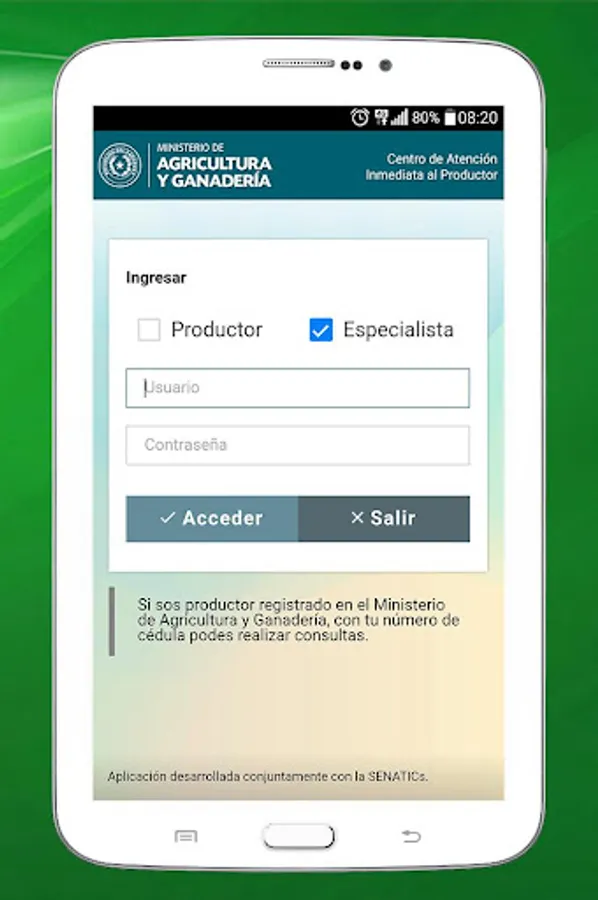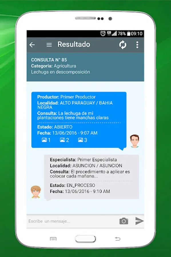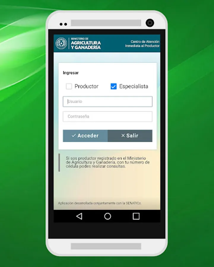 Assistance and support registered with the Ministry of Agriculture and Livestock of Paraguay farmers. It allows queries via smartphones on agricultural and livestock production and obtain remote assistance. You can send photos and interact swiftly in message format.