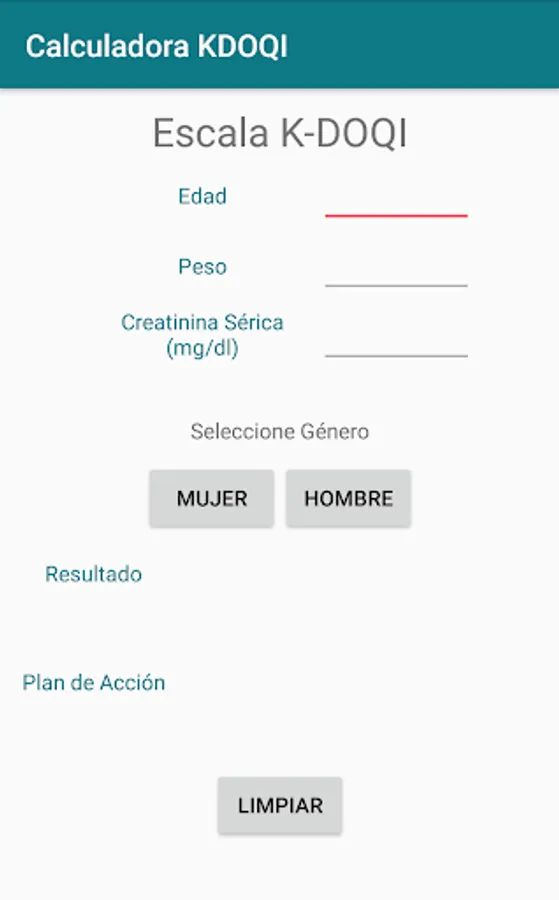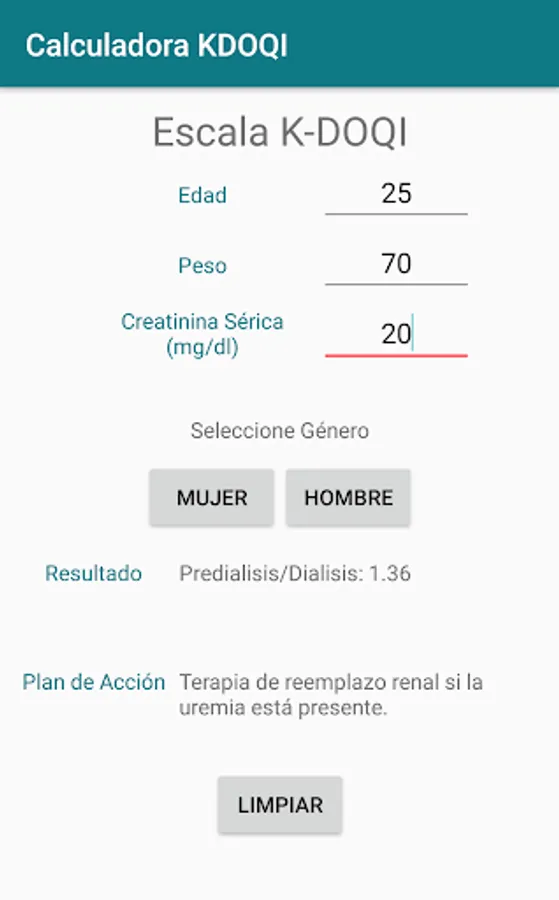 This calculator allows to obtain a result and action plan as Initiative quality of the results of renal disease (Kidney Disease Outcomes Quality Initiative)