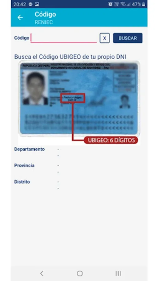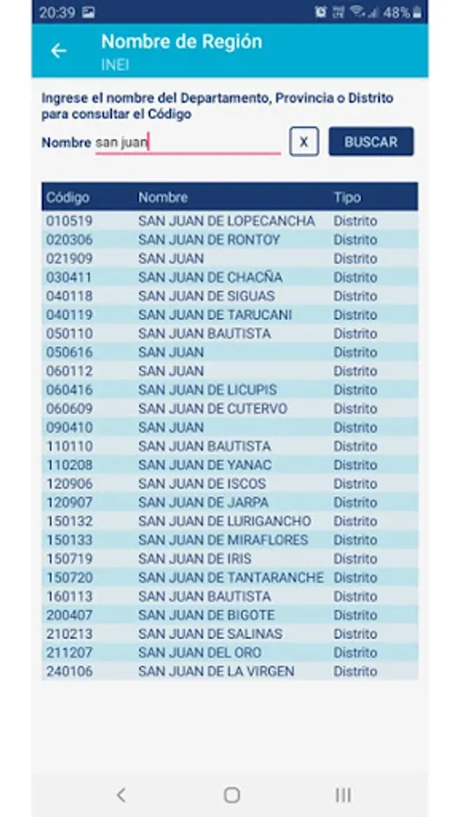 Consult by code or name the UBIGEO of the localities in Peru, according to the table provided by INEI (Instituto Nacional de Estadísticas e Informática) or the RENIEC (Registro Nacional de Identificación y Estado Civil).