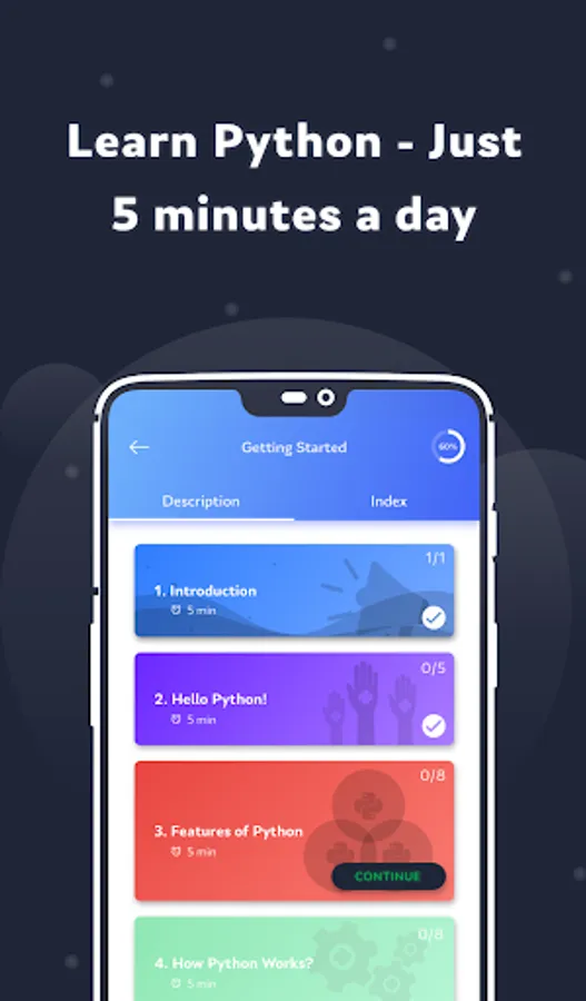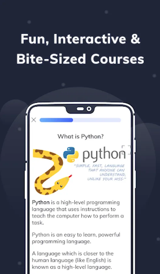 The course content is bite sized and helps you prepare for interviews or examinations. The app is suited for anyone who wants to get started with Python learning.