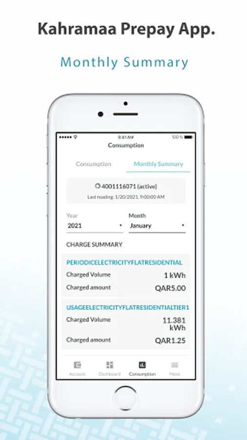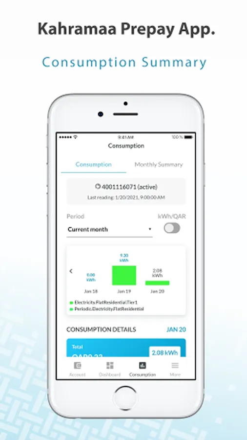 تطبيق إدارة العدادات مسبقة الدفع الخاص بالمؤسسة العامة القطرية للكهرباء و الماء والذي يوفر العديد من الخدمات للمشتركين: