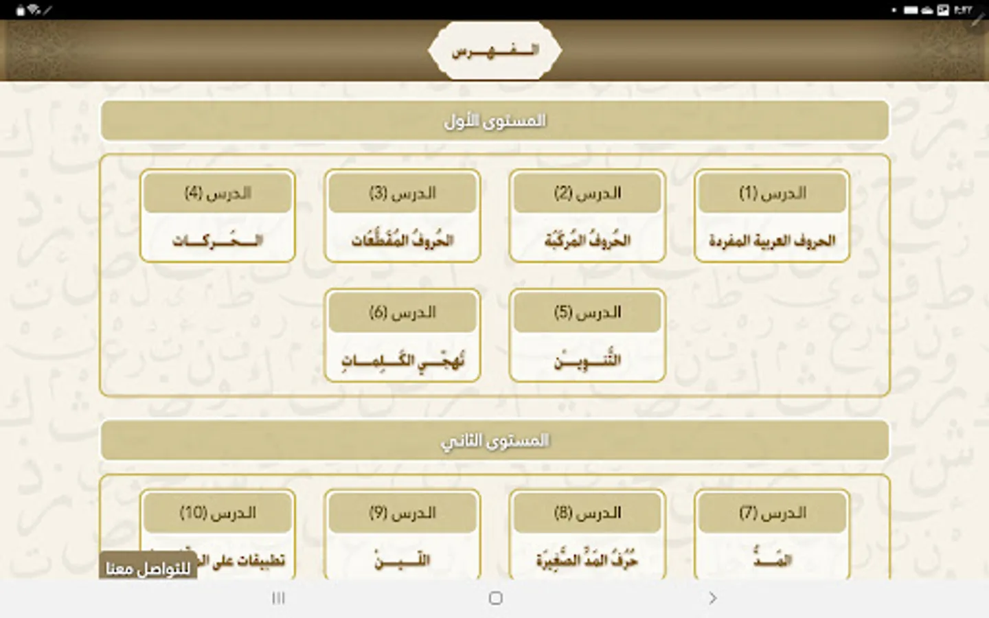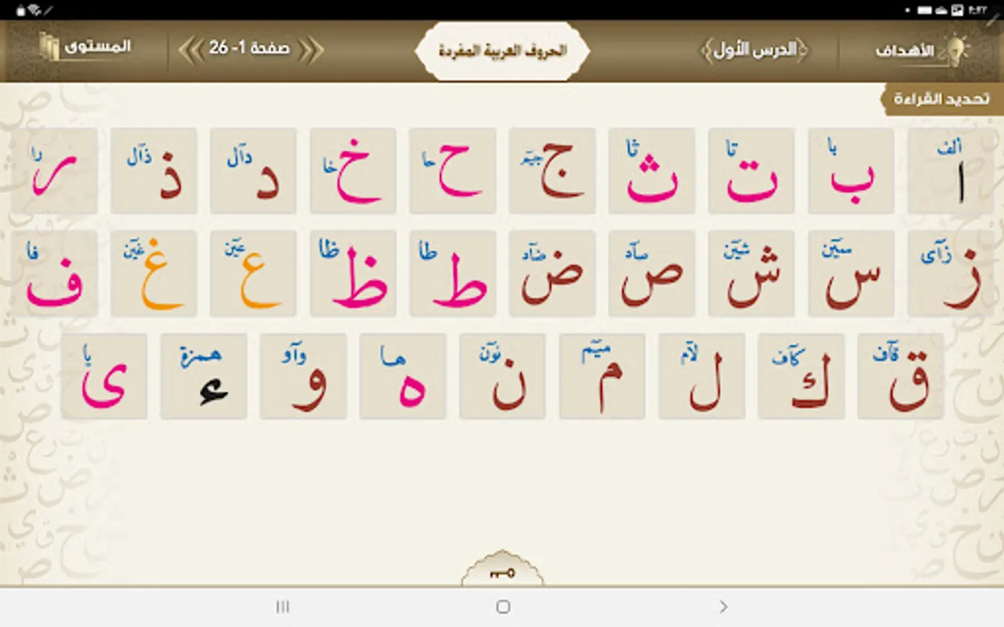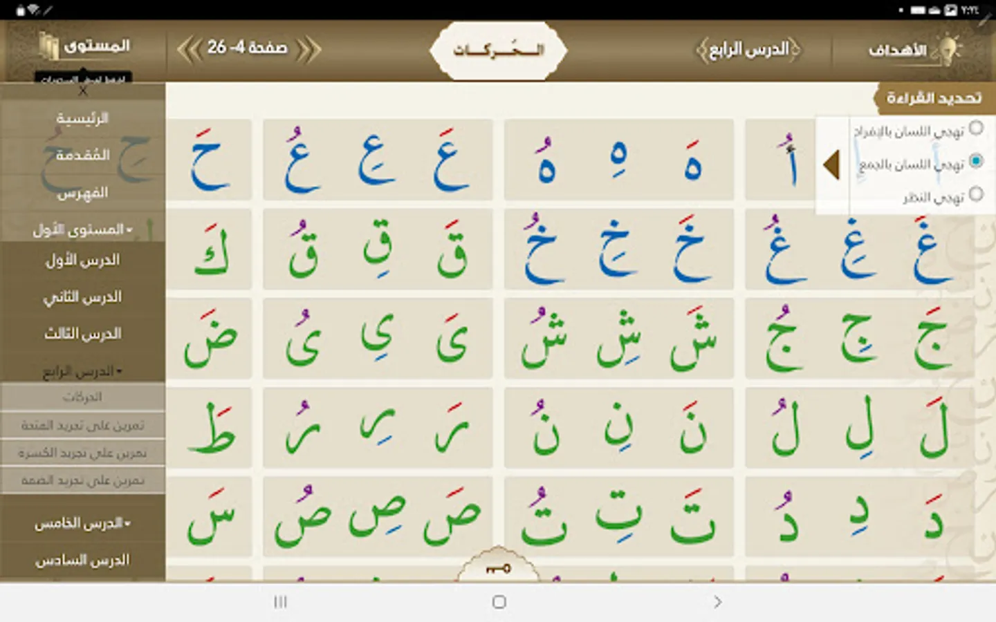The first level: It included singular and compound letters, vowels, tanween, and spelling of words.