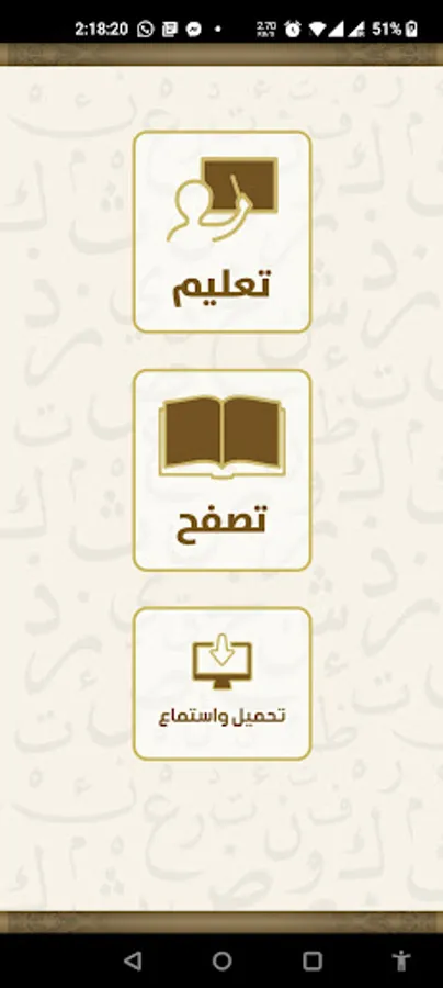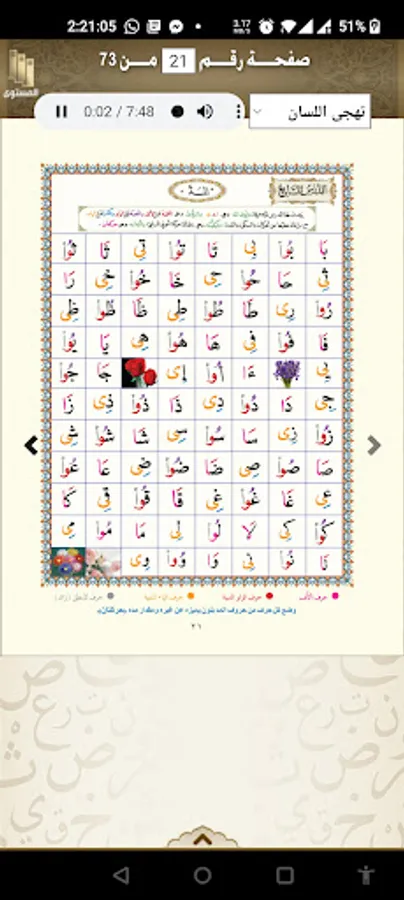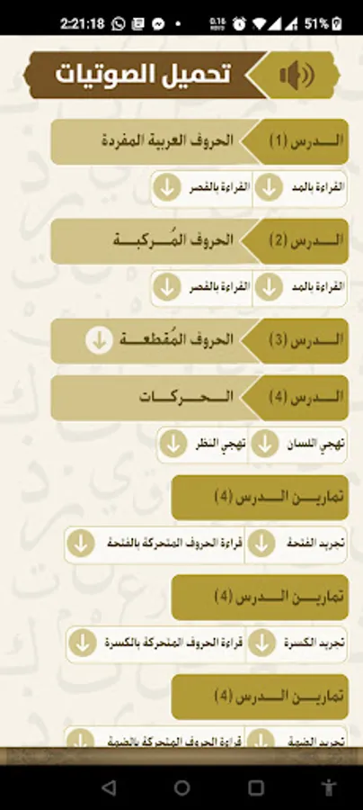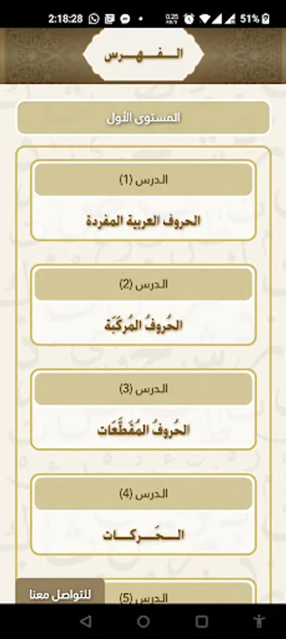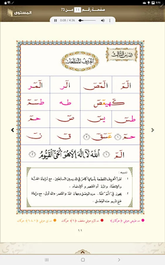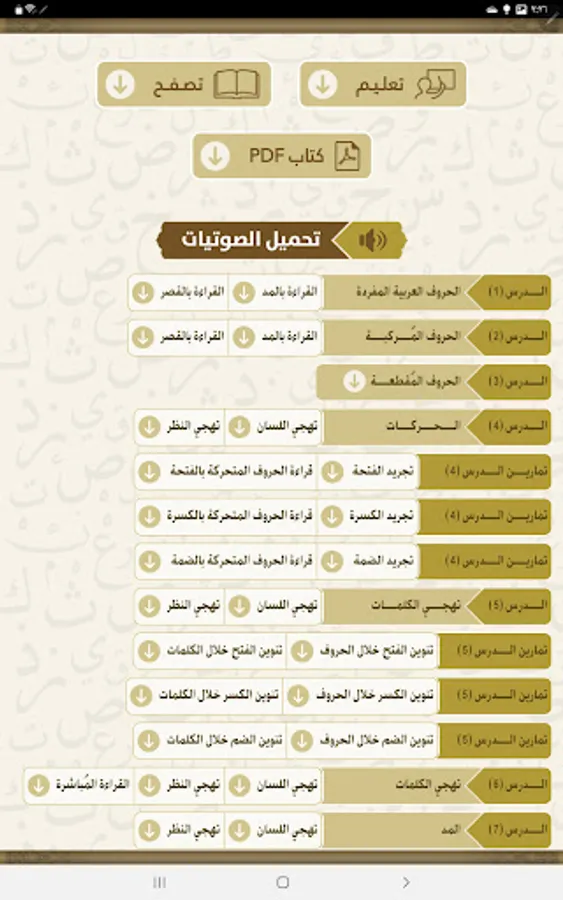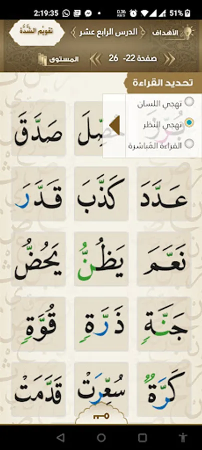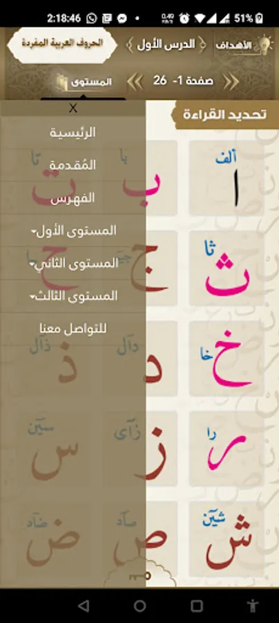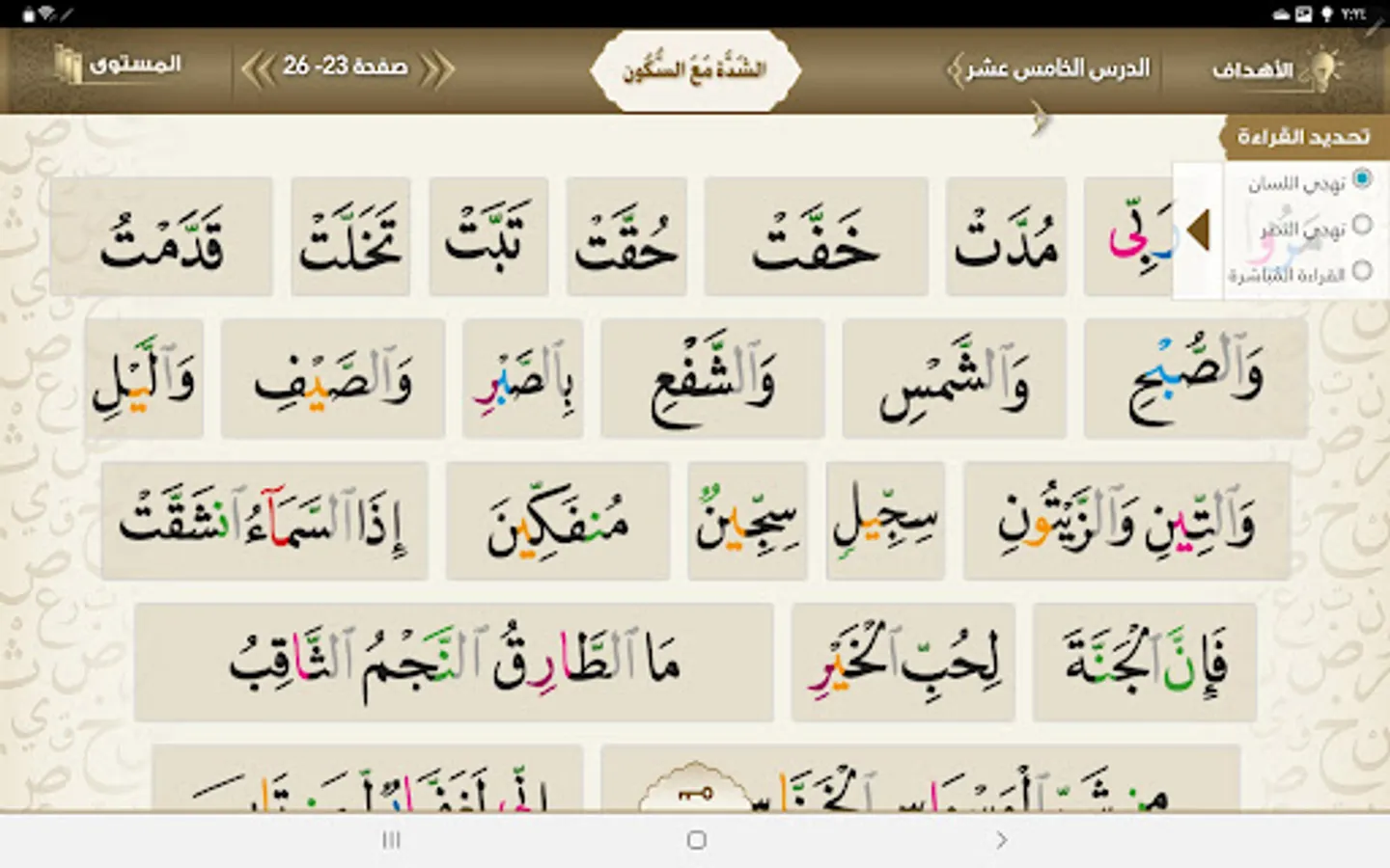 The first level: It included singular and compound letters, vowels, tanween, and spelling of words.