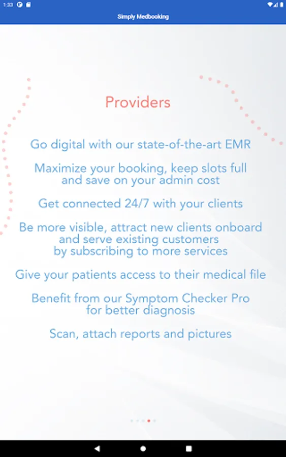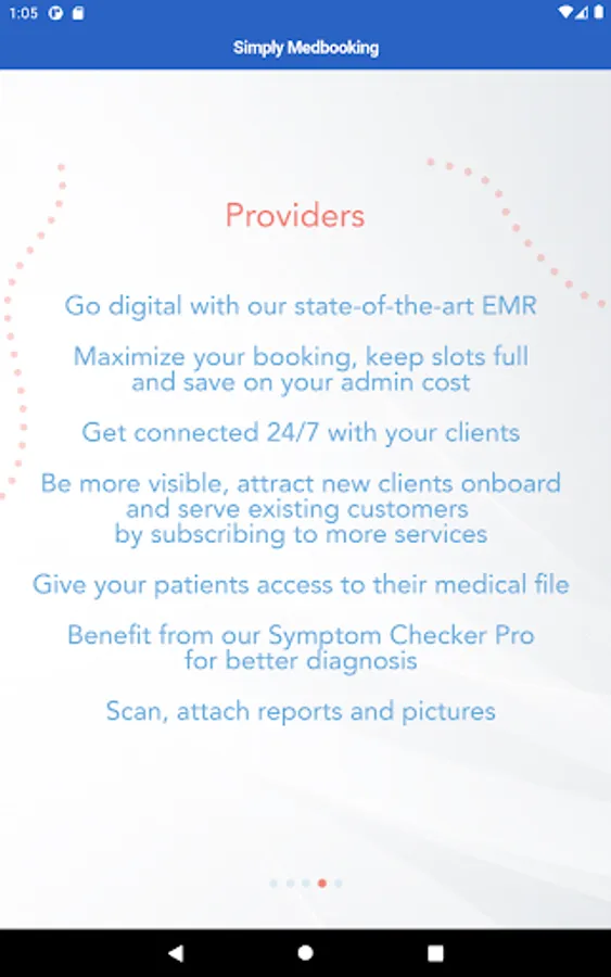 It goes beyond a standard Booking tool as it connects Patients and Medical Professionals together, exchange experience and helps Doctors in taking decisions for the best Clinical and Medical Quality, in accordance to Simply Medbooking Terms of Use.