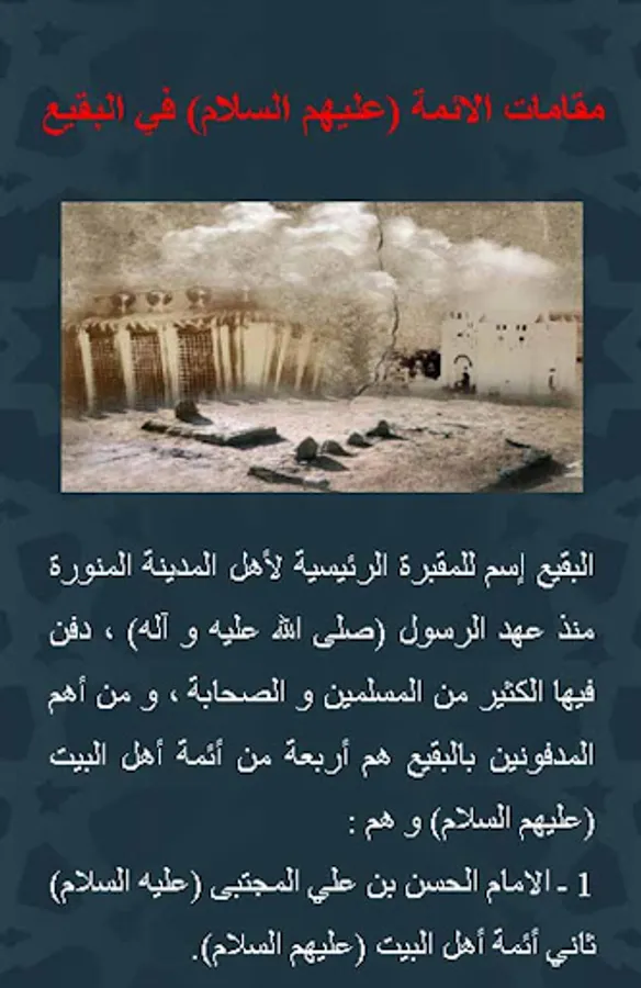 As well as the burial of the wives of the Prophet (peace and blessings of Allah be upon him) except Khadija and Maymonah, as well as the burial place of Ibrahim the son of the Messenger of Allah (may Allah bless him and his family) and others. This has been the tombs of the imams of the people of the House (peace be upon them) domes and shrines, but the Wahhabis more than two hundred years ago they destroyed it with hatred and ignorance.