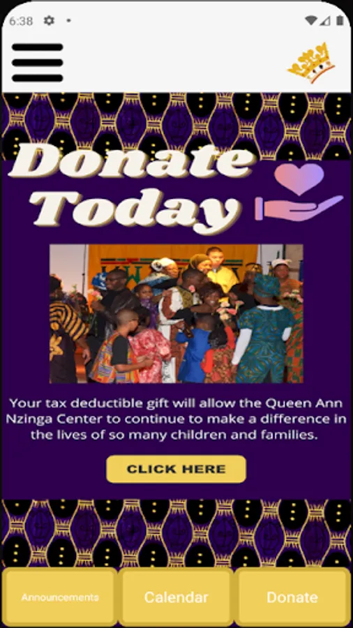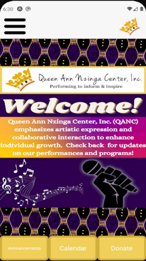 This app allows users to quickly and efficiently receive notifications about upcoming virtual events and performances with the Queen Ann Nzinga Center and allows the Center to be able to remind our program participants of meeting times and more. Users can view upcoming events on an in-app calendar, and read the latest announcements sent out by the Queen Ann Nzinga Center.