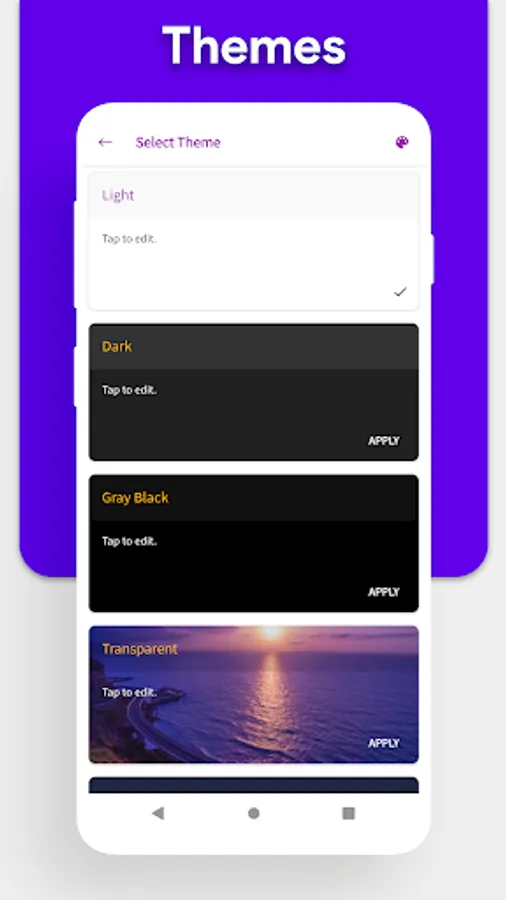 Eon Audio - MP3 Player Pro gives you 9 preset themes (Light, Dark, Black, Transparent (Glossy), Mid Night Blue, Dark Brown, Pitch Black, Deep Purple and Ubuntu) to customize Eon Audio - MP3 Player Pro to make it your own the way you like it. Eon Audio - MP3 Player Pro also includes a built-in Theme Maker which allows to create as many themes as you want.