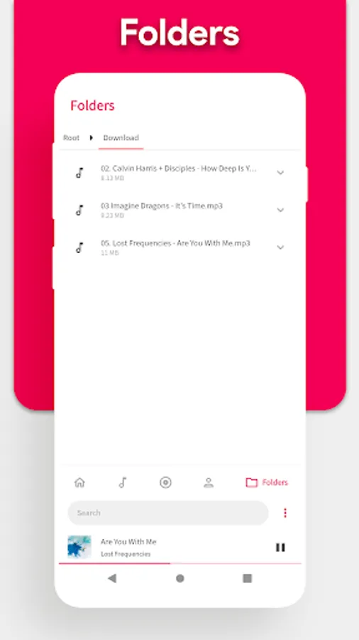 Eon Audio - MP3 Player Pro gives you access to all your audio files with a list of all folders which contain audio files. Eon Audio - MP3 Player Pro also includes Hierarchical folder view.