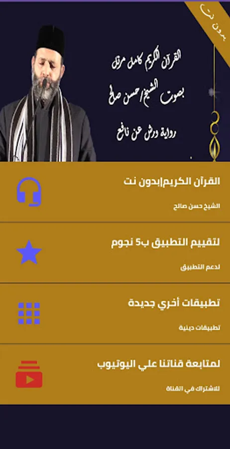 The Holy Qur’an is complete with the narration of Warsh on the authority of Nafi’, starting from Surat Al-Fatihah to Al-Nas, with the voice of the reader, Sheikh Hassan Saleh, without the Internet