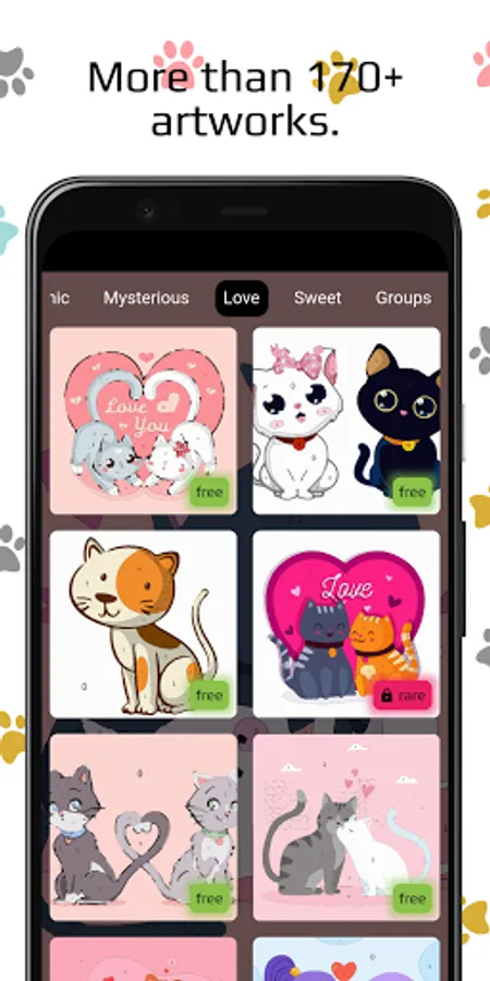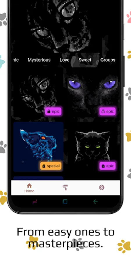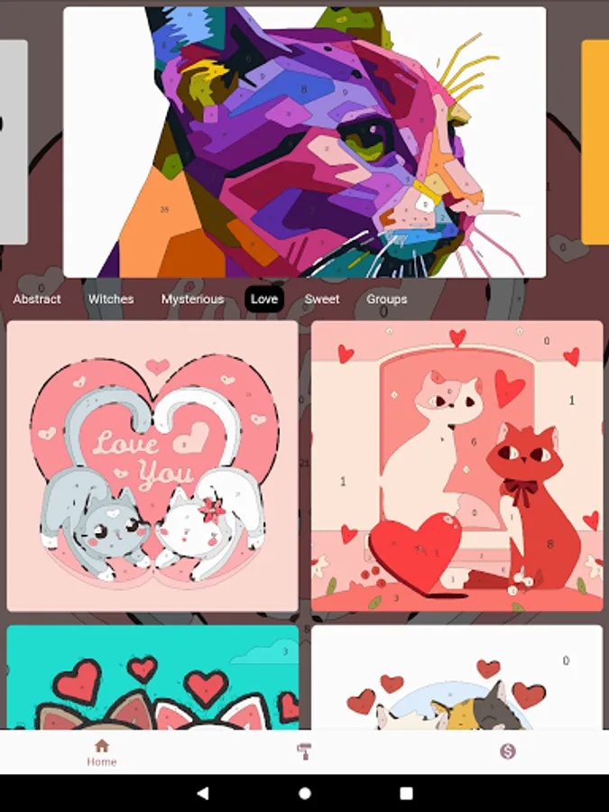 Explore categories like Abstract, Mystical, Love and many more in our app. Share your masterpieces with friends and family, enjoy painting by numbers together!