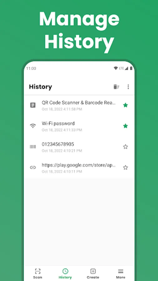 With the barcode scanner & qr reader app, you have full control over your data. Add a scan item to the favorites, clear the history or even disable the history feature manually.