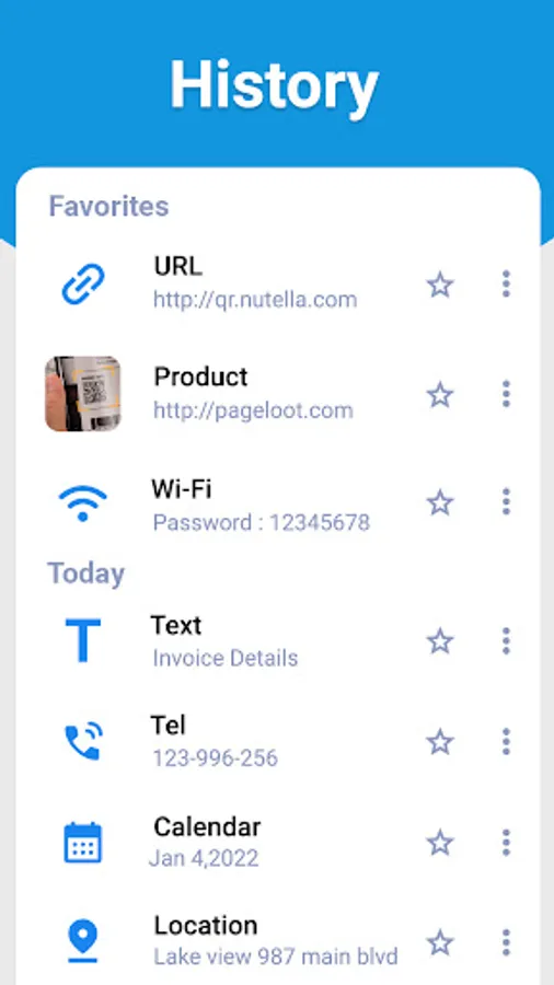 Simple QR scanner app for Android also provides the functionality of the QR code generator which creates QR without any cost. QR code scanner for Wifi password that reads QR code, scans barcode quickly access websites, make payments, track shipments and inventory management. The QR code reader is used for event check and to provide additional information about products or services in the fastest way.