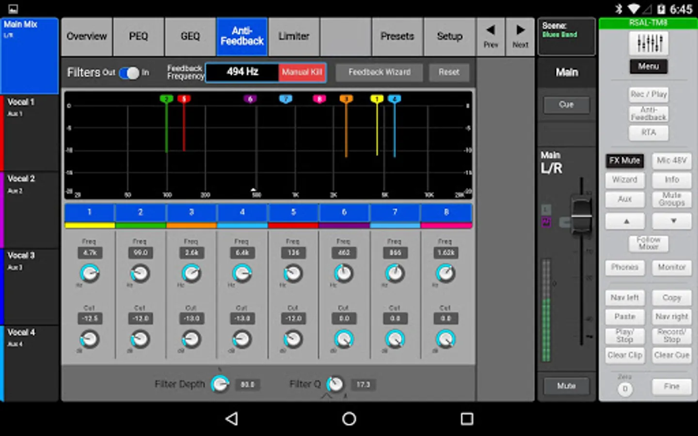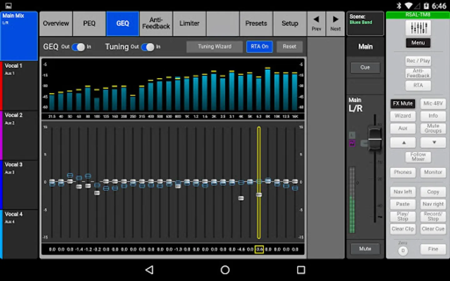 • Output channel processing (1/3 octave GEQ, 6-band PEQ, variable high & Low-cut filters, anti-feedback filters and wizard, delay)