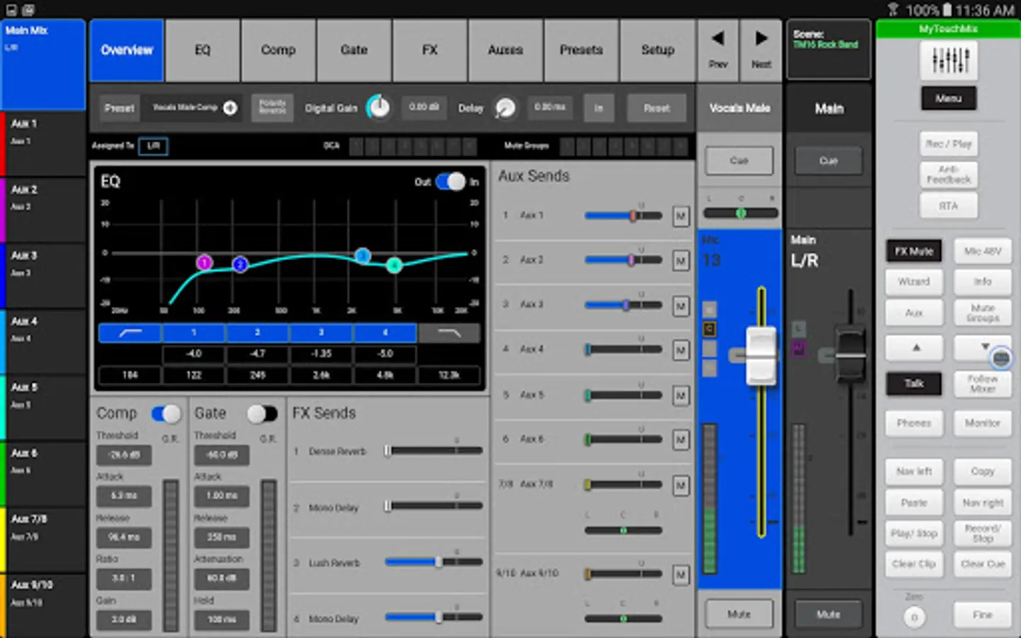When run on a tablet device, the app closely follows the operational paradigm of the mixers. The app and the mixer GUI operate independently so it is possible for the tablet to act as an additional user interface that can display and control a set of functions completely different from those being controlled by the mixer’s screen and hardware. An alternate operation mode – Follow Mixer – is also available. With Follow Mixer engaged, the tablet follows the fader selection on the mixer. Touch a fader on the mixer and the tablet will display that channel’s Overview, EQ, Compressor, Sends or Gate screen. Touch a parameter on the tablet and the mixer’s rotary control will adjust it – or just drag on the tablet screen. When used without an actual TouchMix, the app acts as a demonstration of the mixer GUI and functionality but does not control audio in any way.