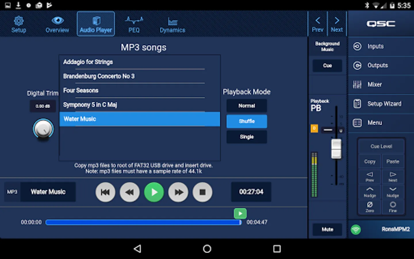 MP Install is used by designers and installers of business music systems to configure and control QSC MP-M40 or MP-M80 music and paging mixers. These mixers, offering unprecedented capabilities combined with ease of configuration and operation are intended for retail and hospitality applications in which paging messages and high-quality audio from various sources is routed to multiple zones. Live mixing functions are also supported for applications requiring reinforcement of entertainment, presentations or conferences.