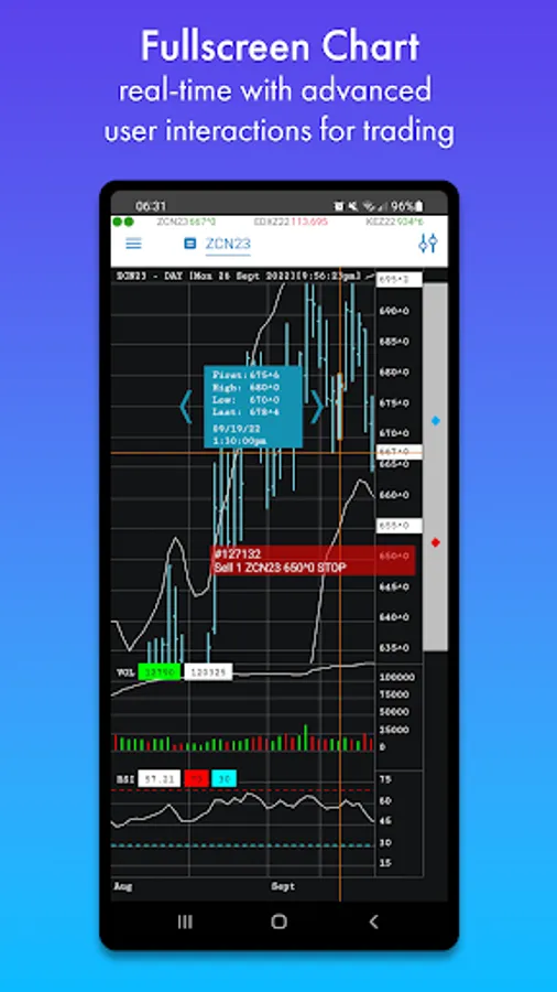 Full screen charts offering a wide selection of tools, settings and programmable indicators.