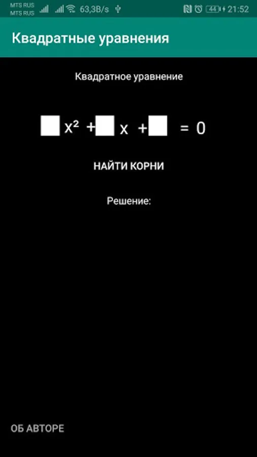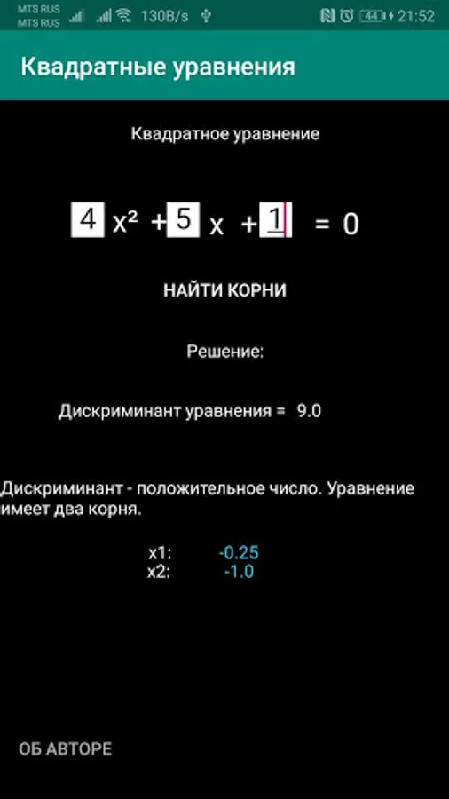 Приложение позволяет находить решение квадратного уравнения. Быстрый отклик, понятный интерфейс.