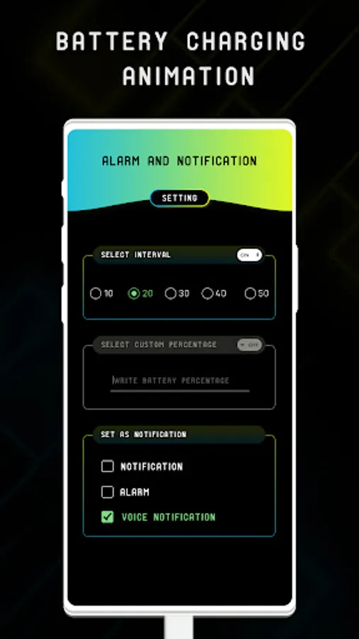 Battery Charging Animation will notify you while charging reached at set interval time.