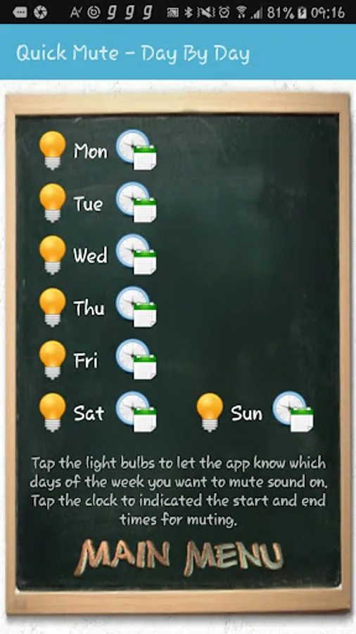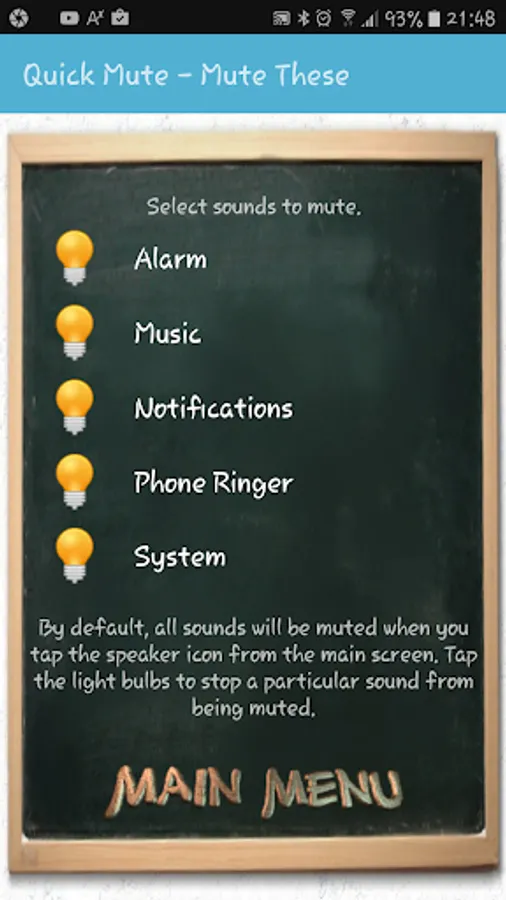 Important: Before running this app. Please adjust your sounds exactly the way you wish because the app remembers the way you originally had the sound levels prior to using the app. When you mute the sounds and restore them, the original levels will be restored.